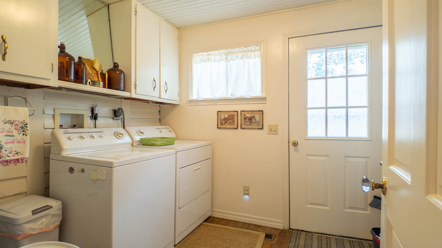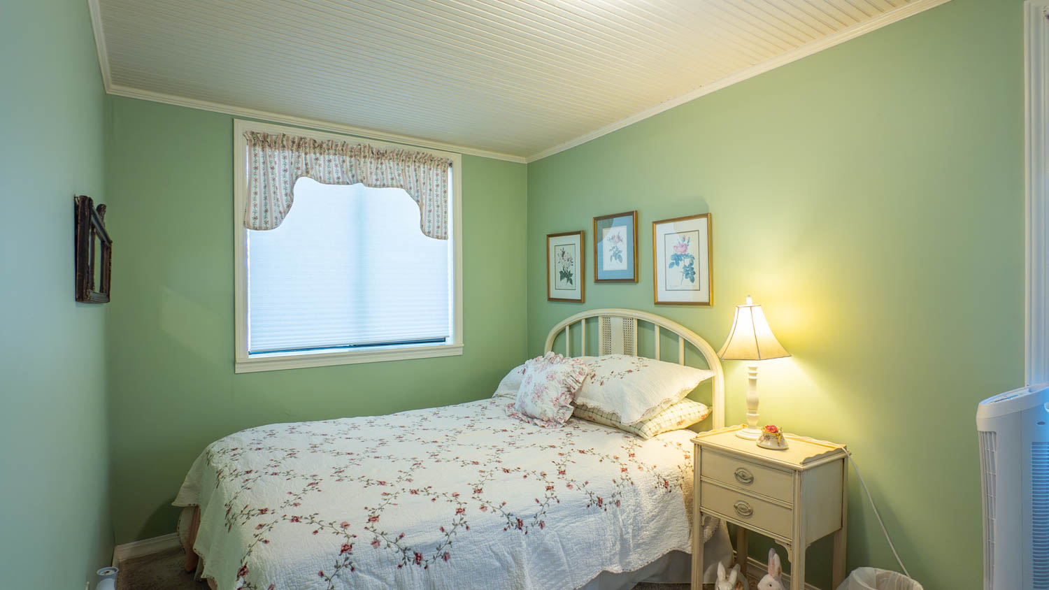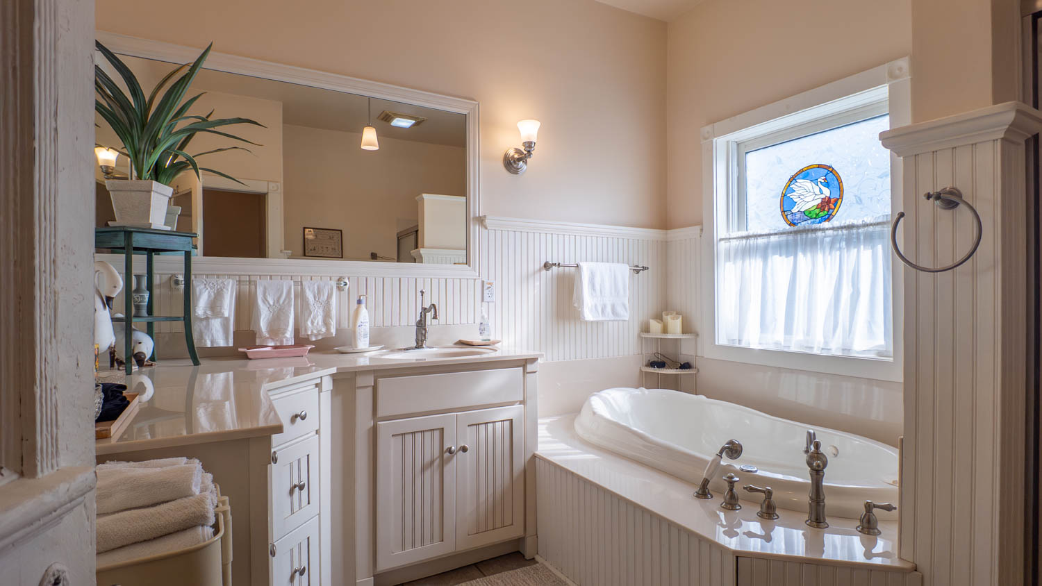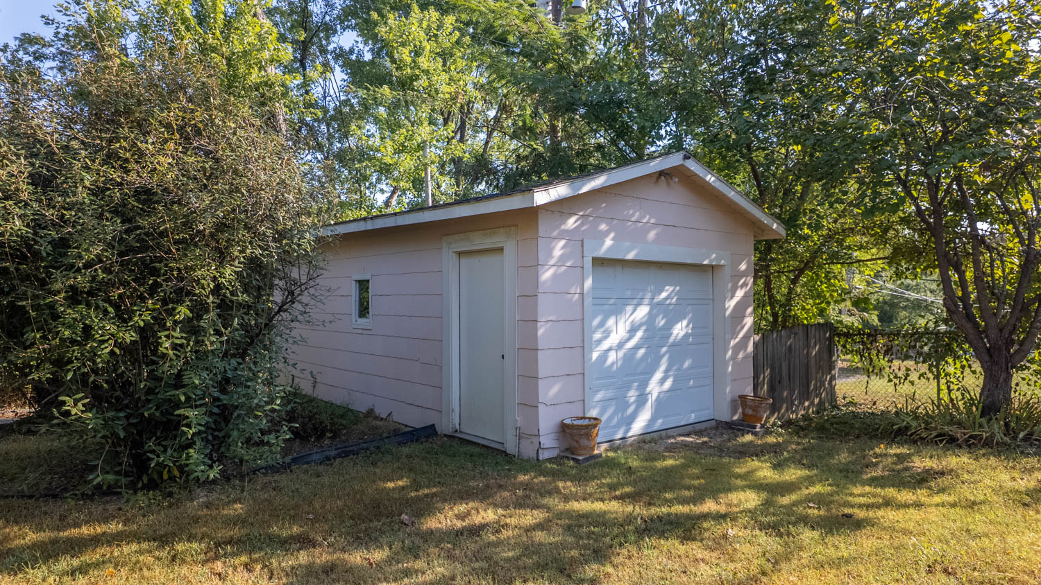 The property is partially fenced and beautifully landscaped with mature trees, while a detached garage with concrete floors and electric offers both parking or shop potential. Back inside, another main-level bedroom and custom-tiled bathroom provide comfort and character with a jetted tub and walk-in shower. Upstairs is currently used as a third bedroom and features two cozy alcoves for sleeping, play areas, or office space, plus a full bath and additional storage. The small unfinished basement houses utilities but also doubles as storm shelter or storage for canned goods.