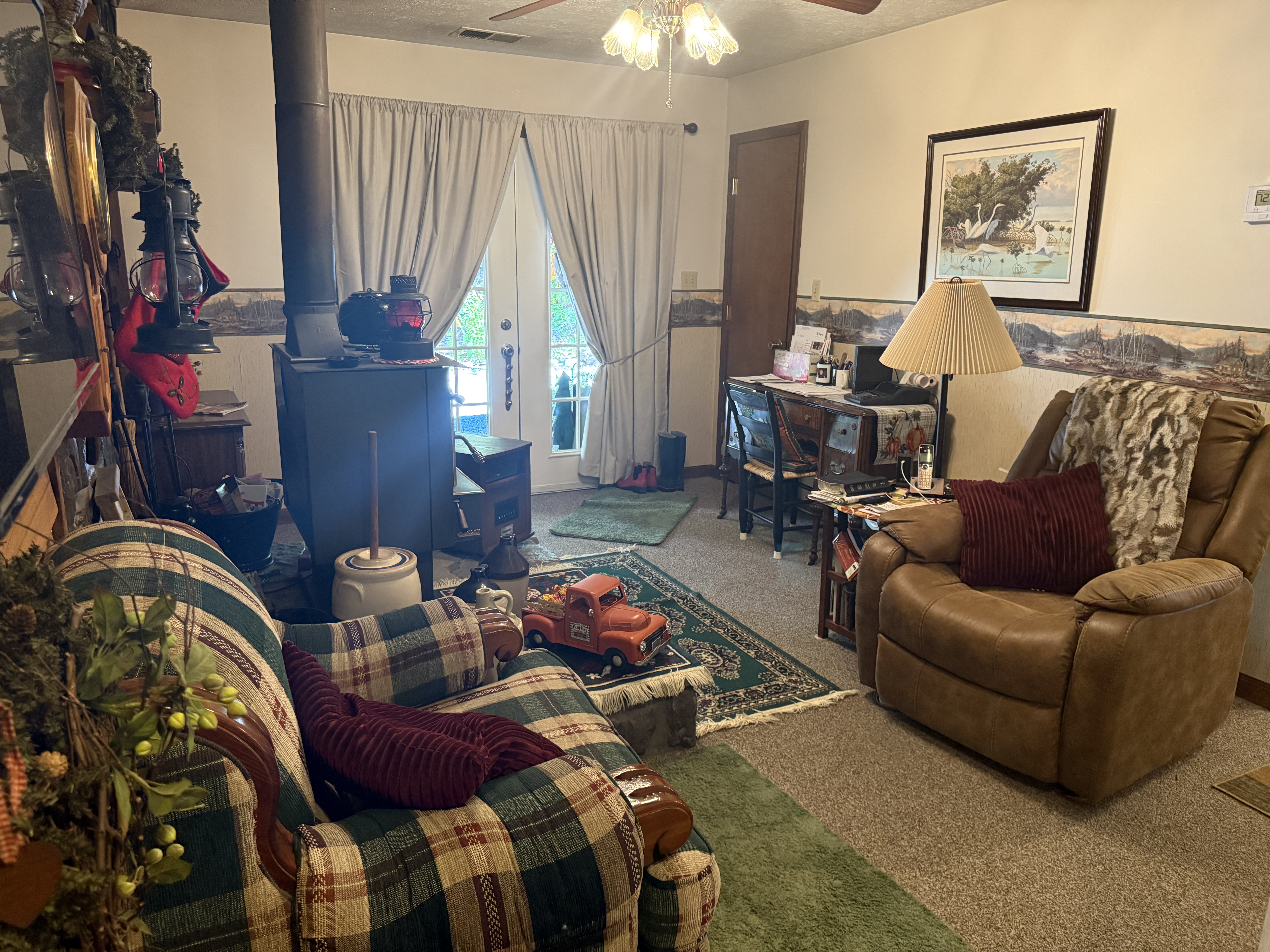 Explore three bedrooms and two and a half bathrooms, including a small office space that could double as a walk-in pantry, a den with a wood-burning stove and French door access to the outdoors, and a large laundry room. Upstairs, two additional bedrooms offer a cozy retreat, with one bedroom featuring a half bath.