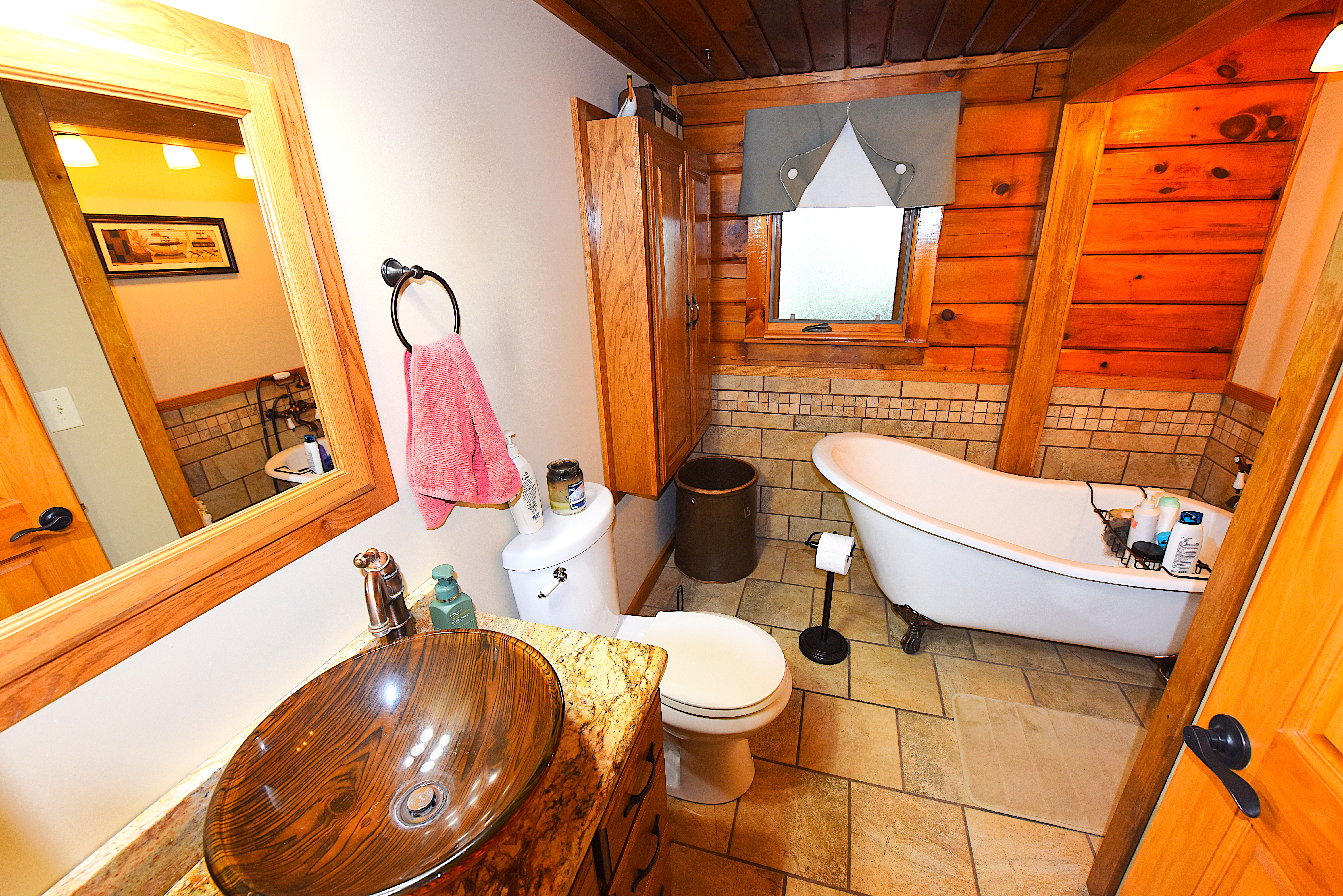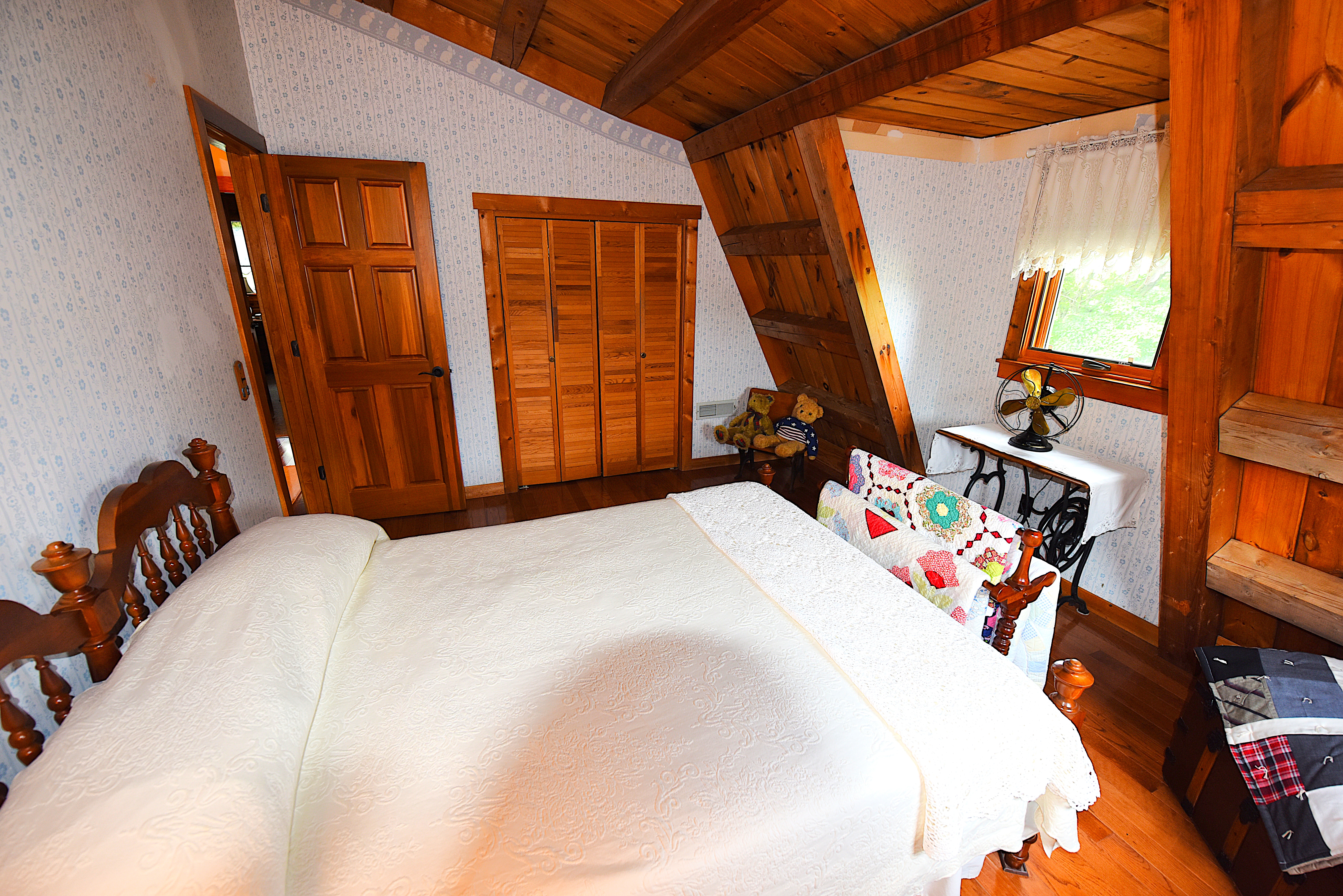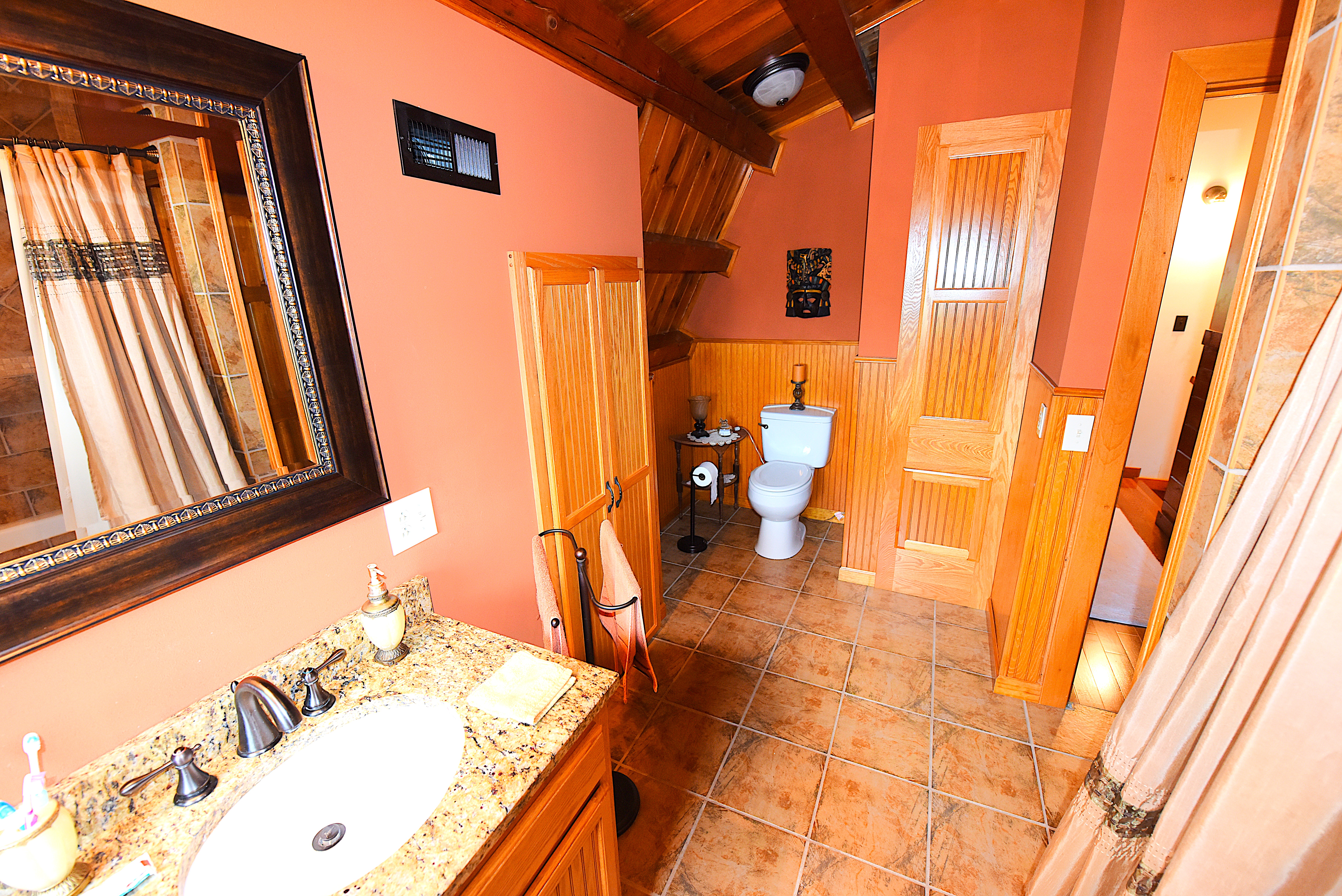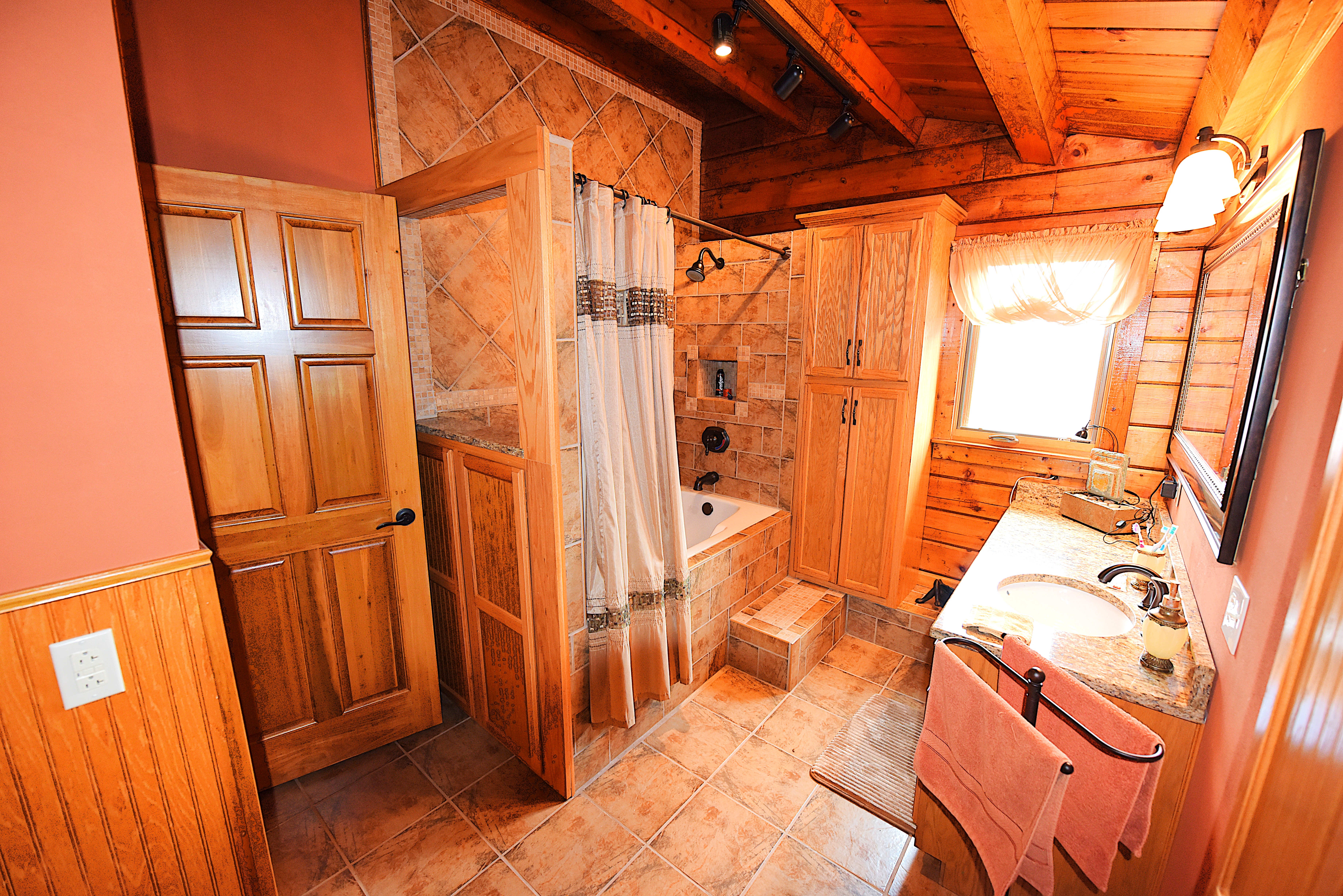 House – Main Floor: The main floor consists of the tiled kitchen with granite countertops, the fireplace front room, the piano sitting room, a full-bathroom, a laundry-sewing room, and a large (24’x32’) screened, tiled covered porch. Tongue-and-groove pine paneling adorn most of the walls and ceilings, which rest on the exposed ceiling beams. All the flooring on this level consists either of white oak, tongue-and-groove hardwood flooring or tile. Quality work and quality materials are evident throughout. All doors throughout the house are solid, hardwood doors. Oak cabinetry on all floors adds beauty and lasting functionality in each room.