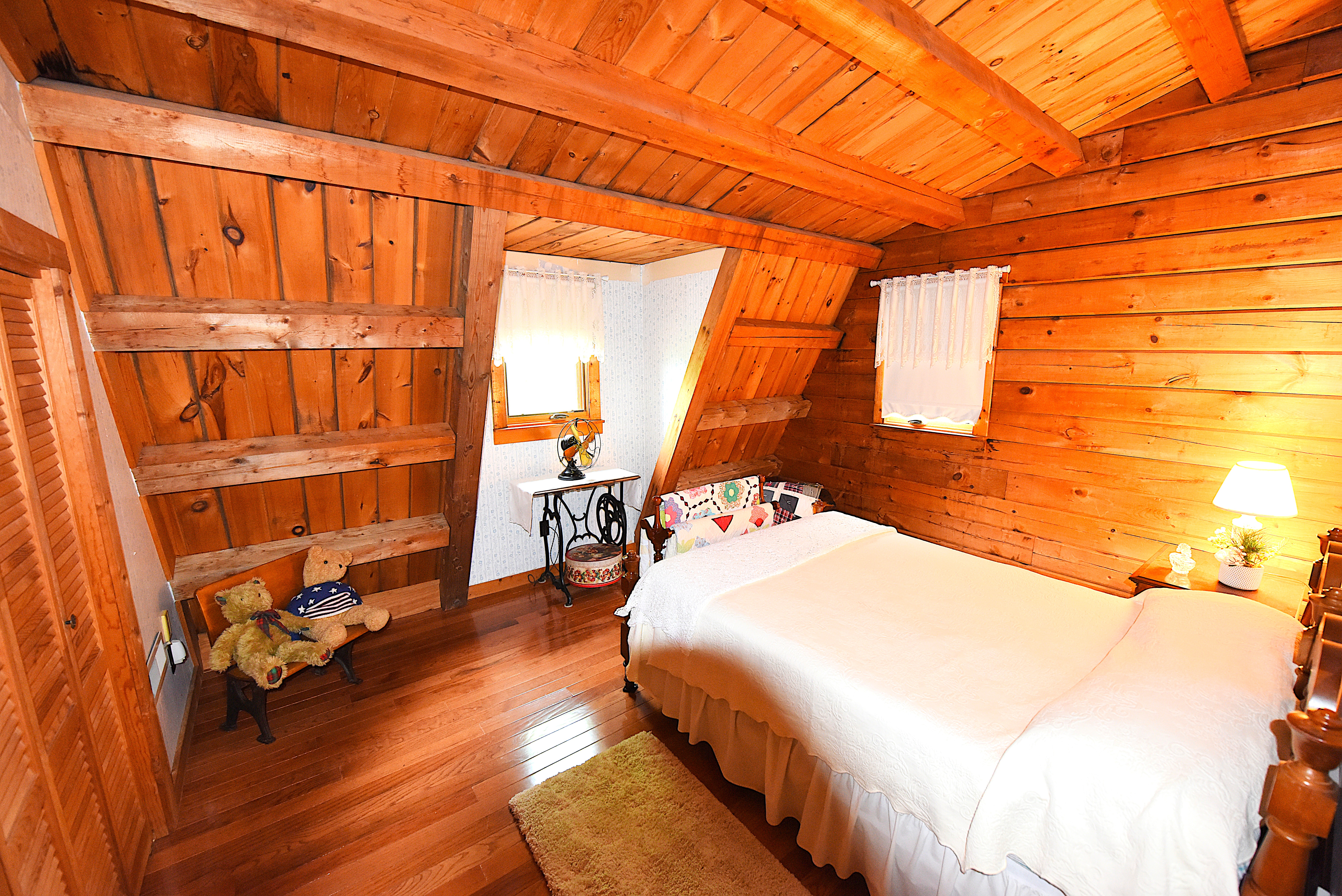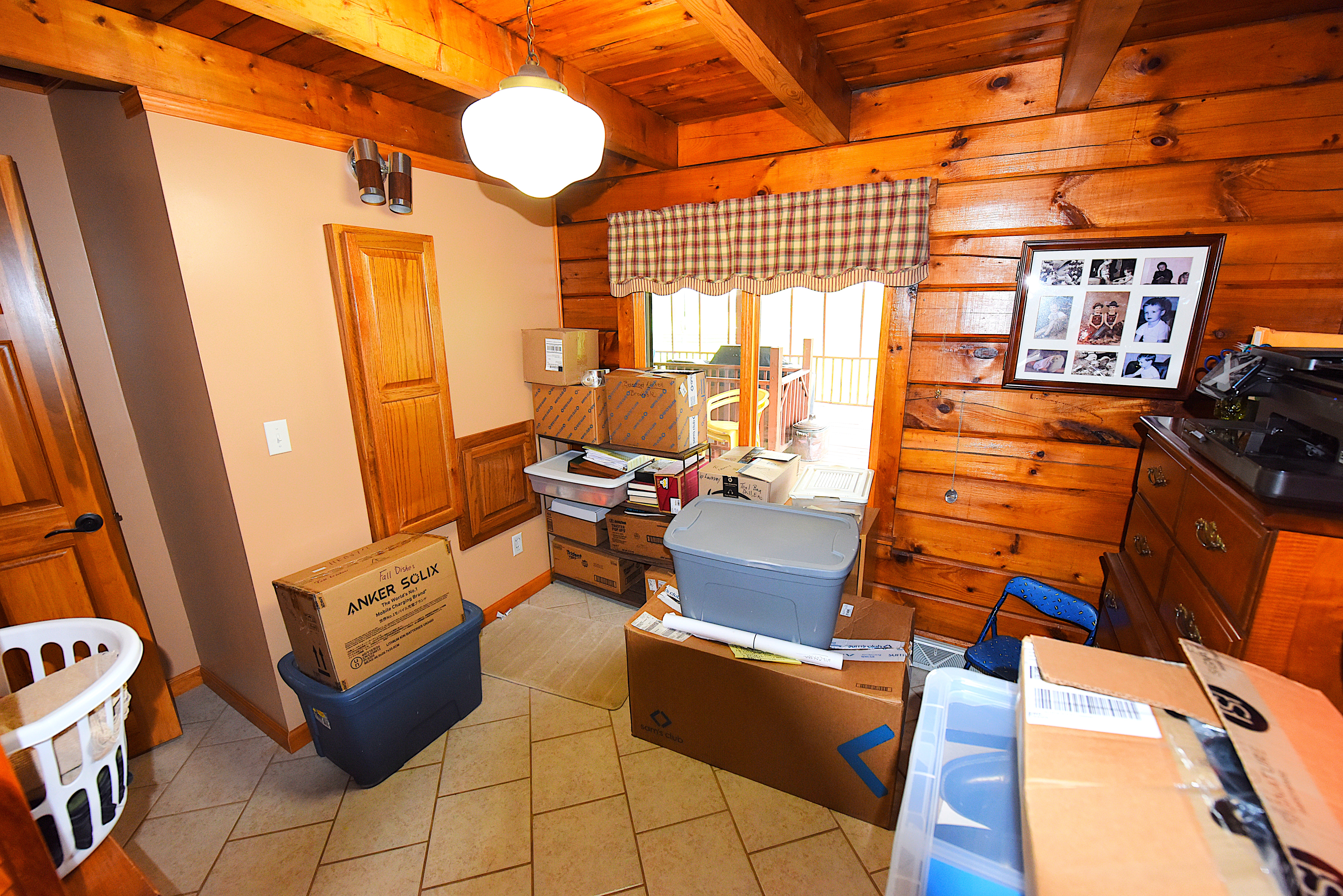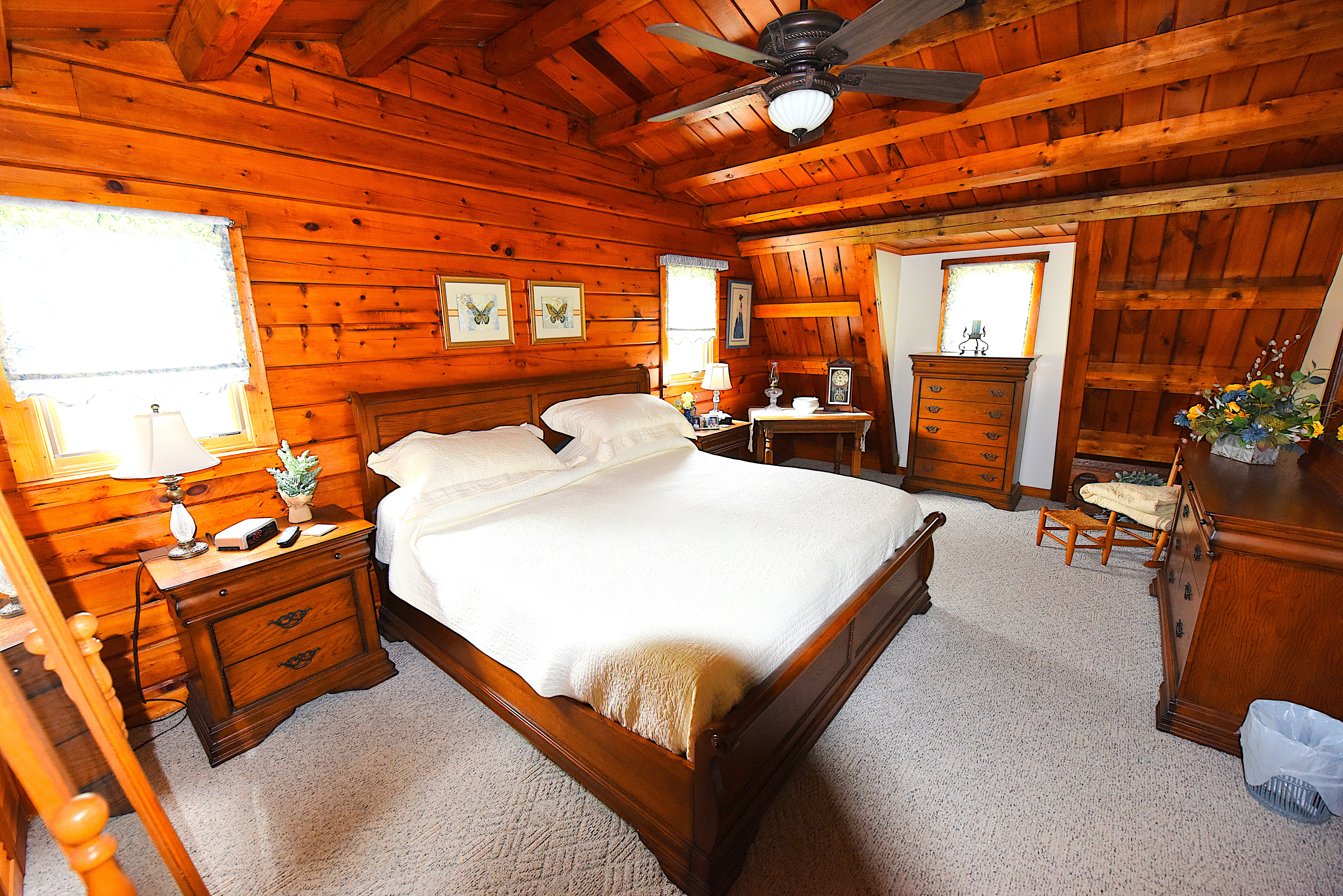 House – Main Floor: The main floor consists of the tiled kitchen with granite countertops, the fireplace front room, the piano sitting room, a full-bathroom, a laundry-sewing room, and a large (24’x32’) screened, tiled covered porch. Tongue-and-groove pine paneling adorn most of the walls and ceilings, which rest on the exposed ceiling beams. All the flooring on this level consists either of white oak, tongue-and-groove hardwood flooring or tile. Quality work and quality materials are evident throughout. All doors throughout the house are solid, hardwood doors. Oak cabinetry on all floors adds beauty and lasting functionality in each room.