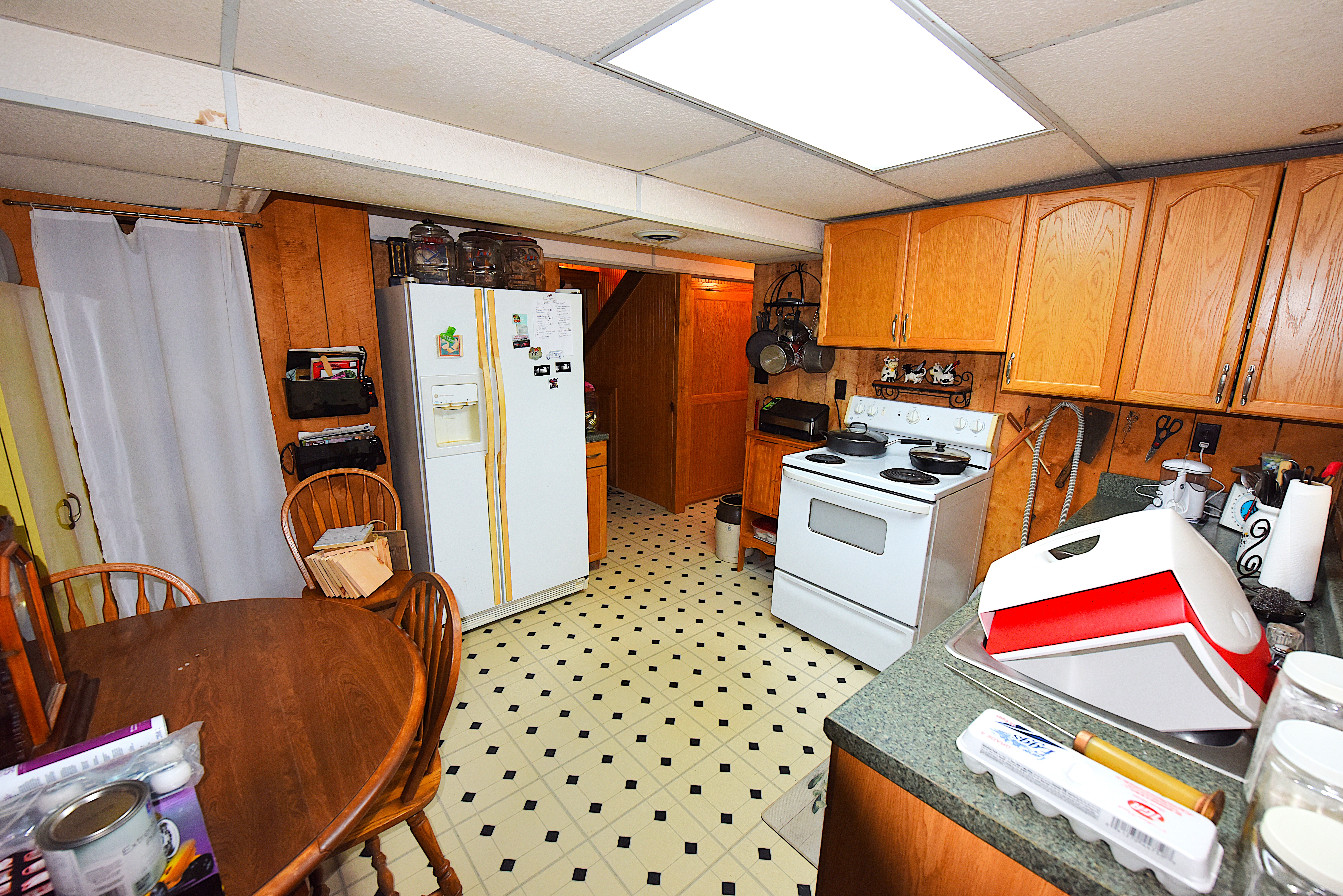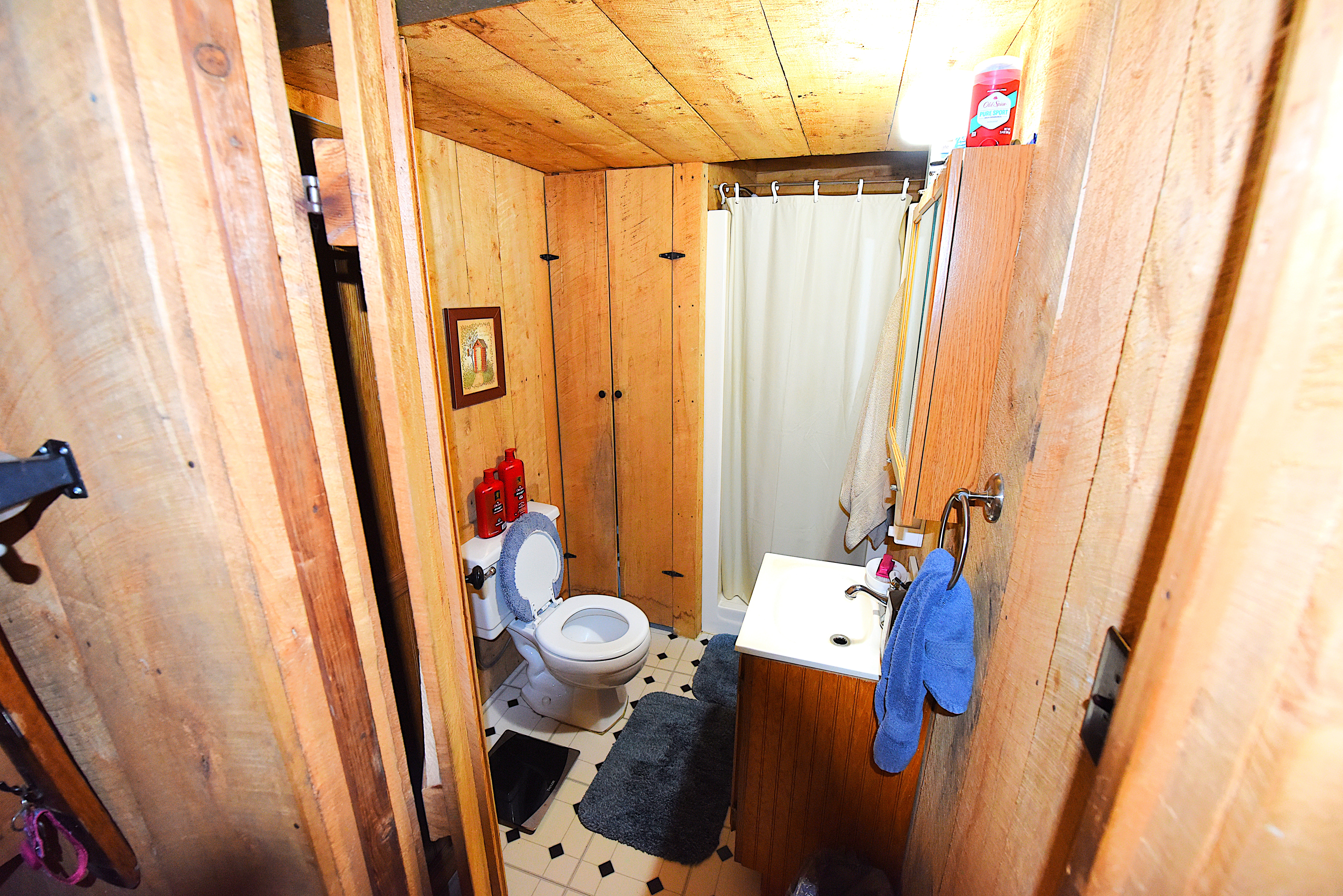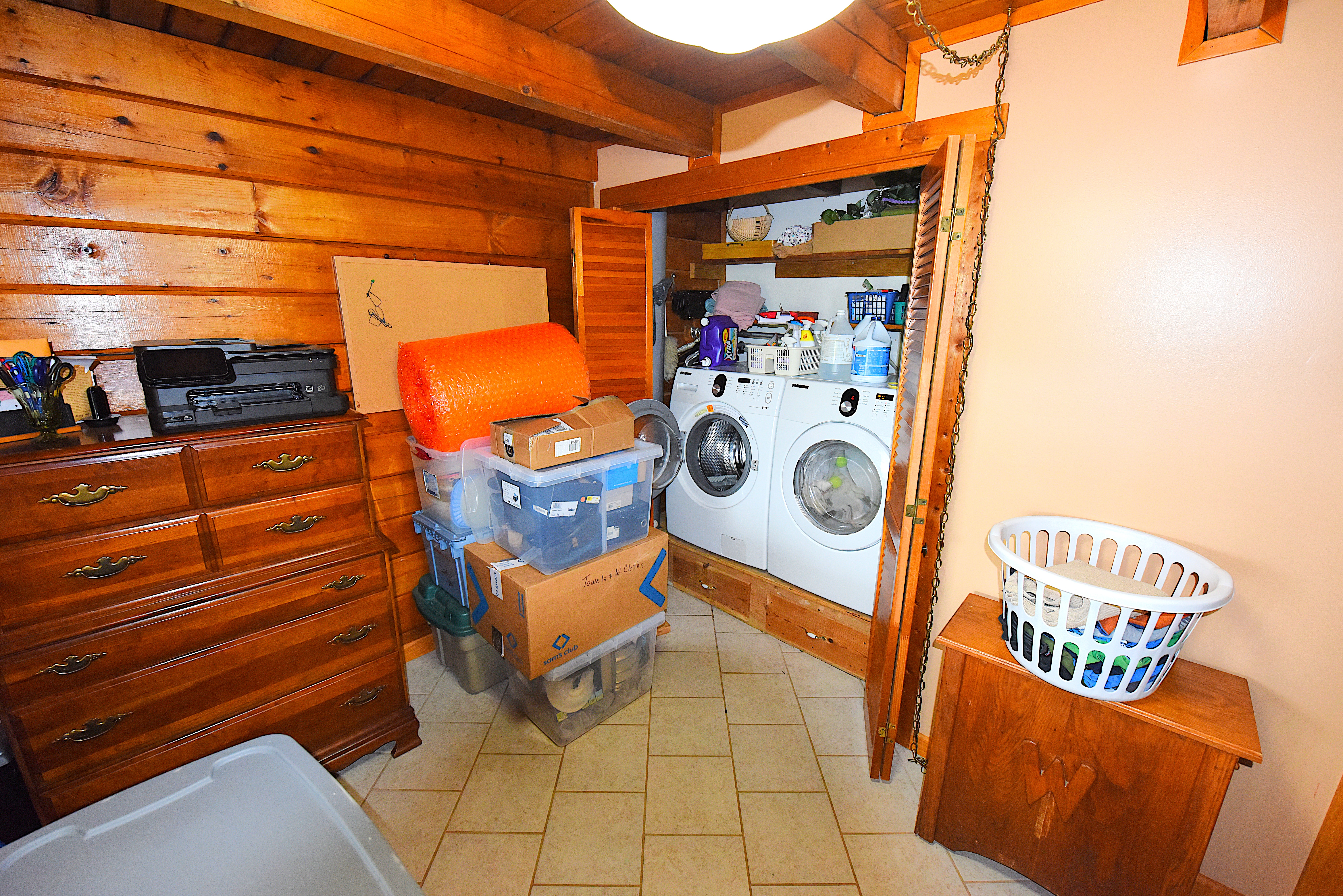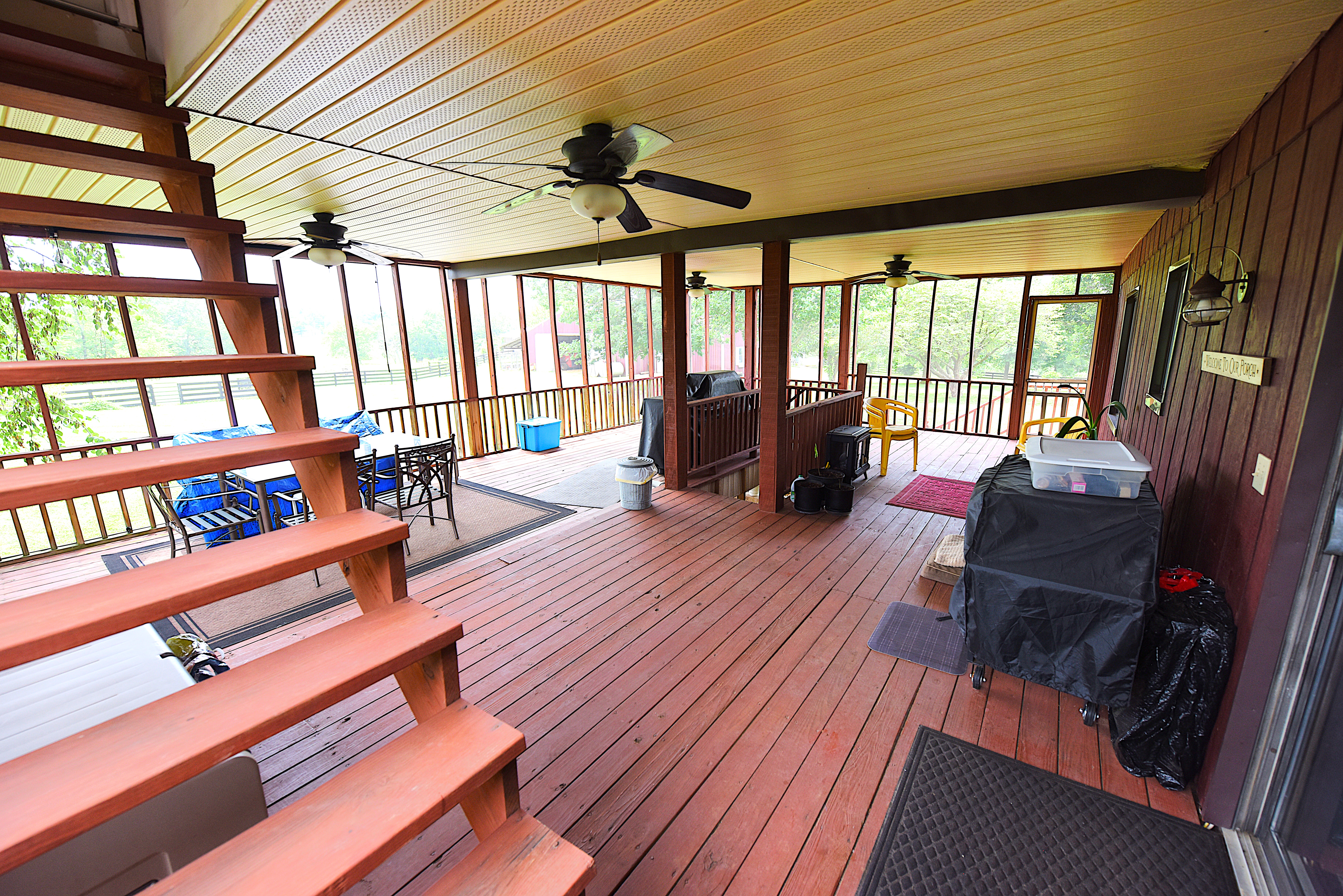 House – Main Floor: The main floor consists of the tiled kitchen with granite countertops, the fireplace front room, the piano sitting room, a full-bathroom, a laundry-sewing room, and a large (24’x32’) screened, tiled covered porch. Tongue-and-groove pine paneling adorn most of the walls and ceilings, which rest on the exposed ceiling beams. All the flooring on this level consists either of white oak, tongue-and-groove hardwood flooring or tile. Quality work and quality materials are evident throughout. All doors throughout the house are solid, hardwood doors. Oak cabinetry on all floors adds beauty and lasting functionality in each room.