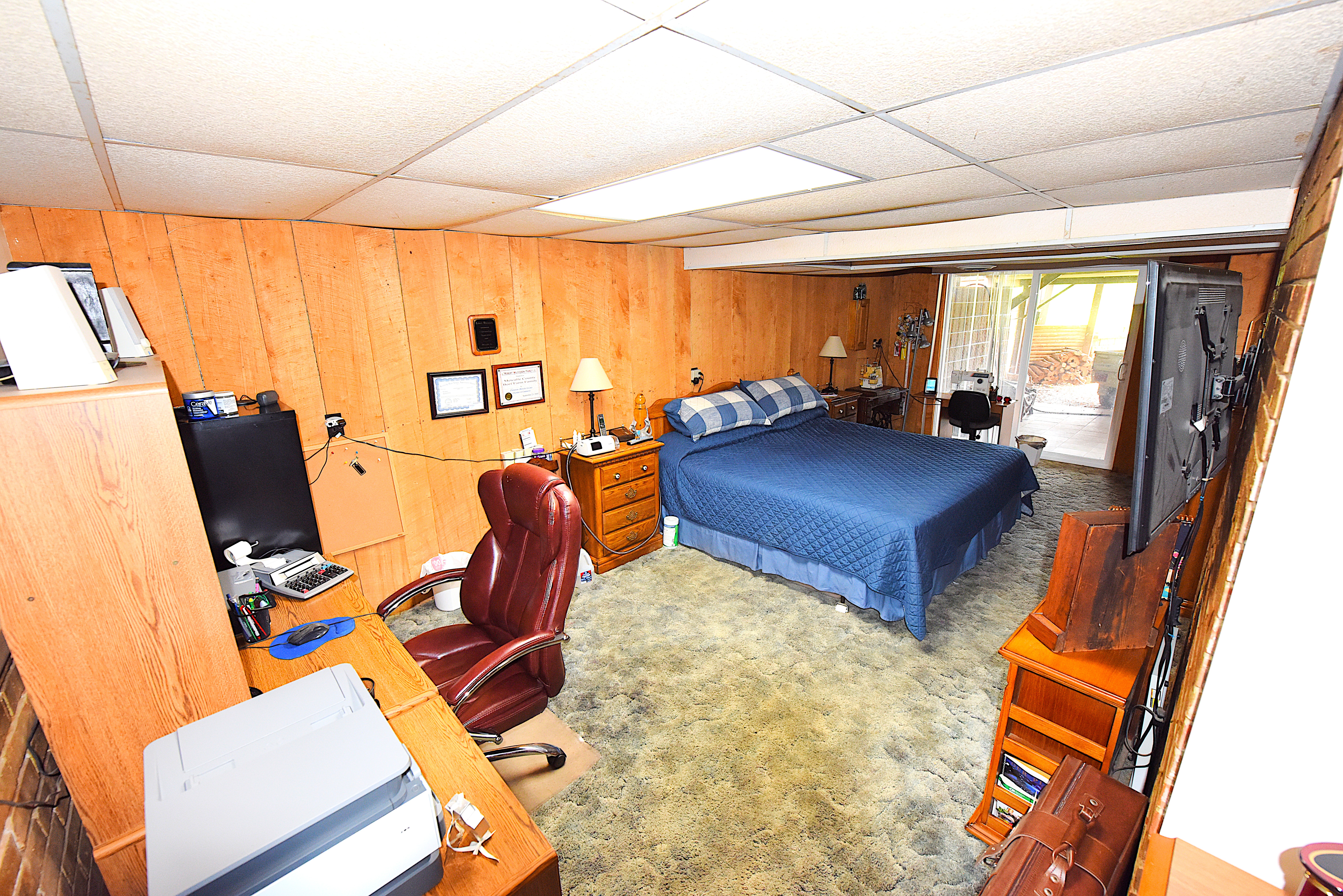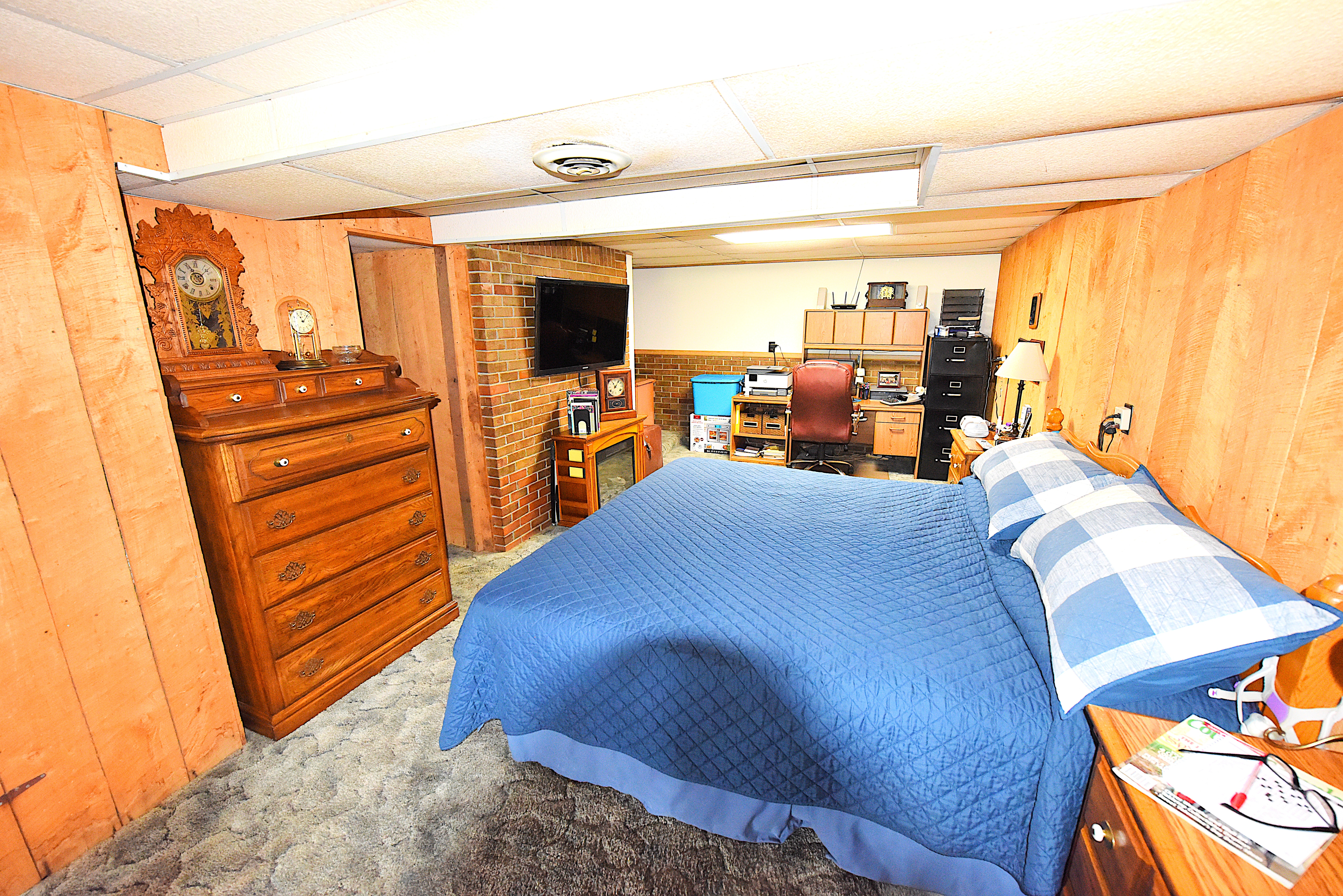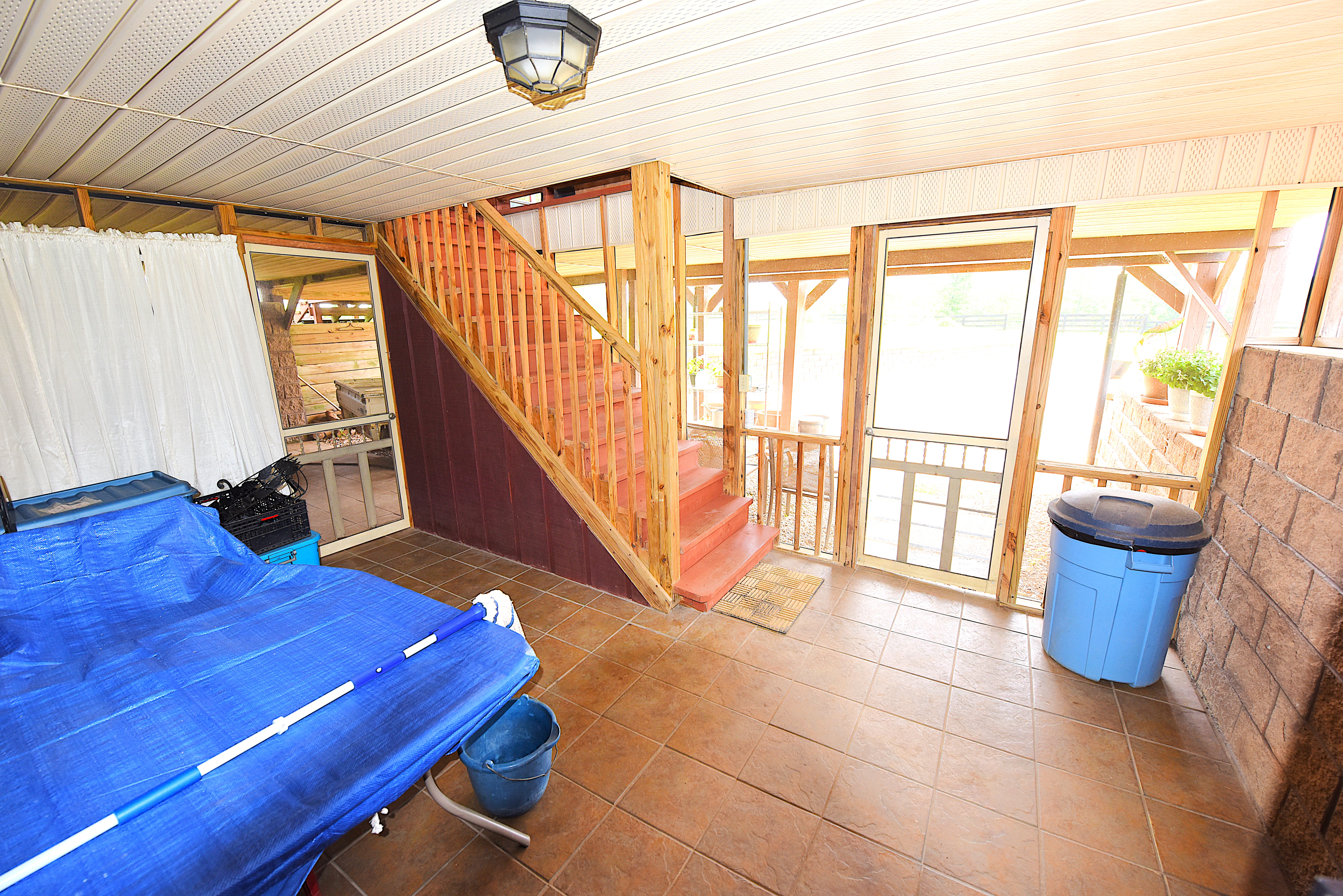 Basement: The fully furnished and functional basement consists of a master bedroom with fireplace, a full bathroom, a fully functional kitchen, and a workshop room. The basement is a walk-out, daylight basement. Attached to the basement is a screened, tiled, covered porch, and a tiled, open, covered porch.