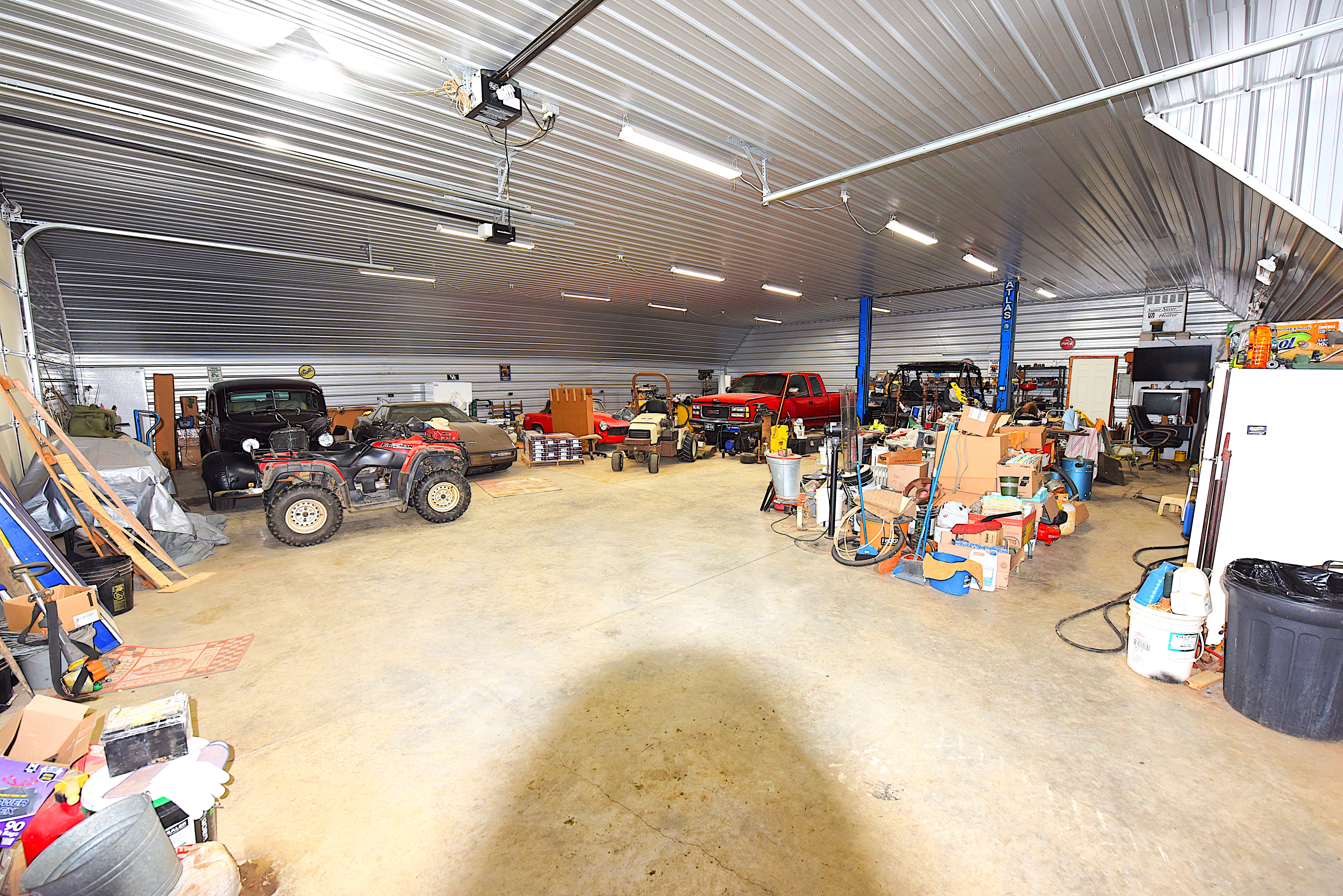 Shop: The shop measures 60’ x 50’ for 3,000 sq ft. Metal siding and ceiling add lasting quality to the well-lighted shop and concrete flooring. Two overhead doors provide easy access to the outside and the barn. The shop includes a bathroom.