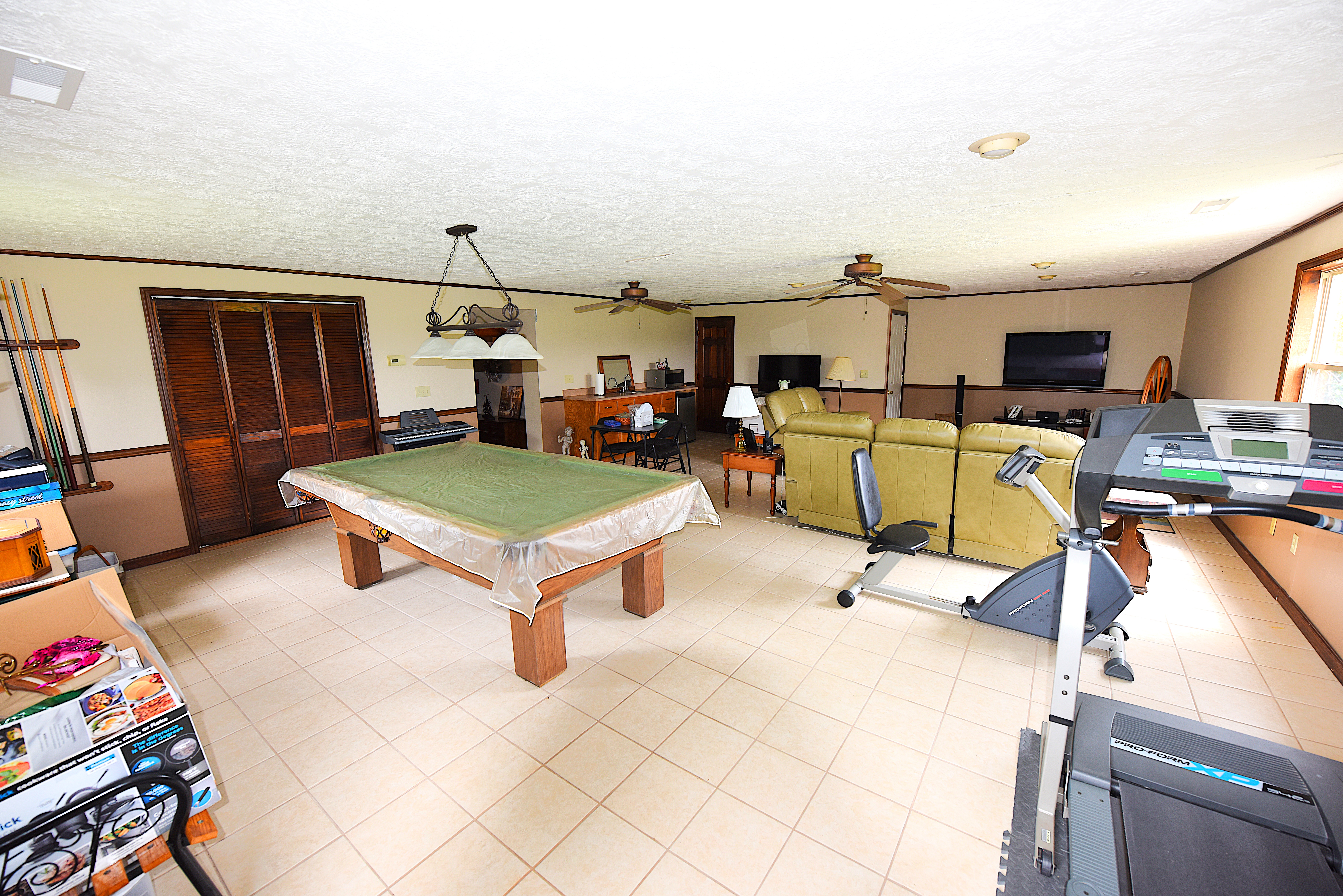 Second Floor/Recreation Center: The second floor offers a luxurious, large, carpeted master bedroom, finished with tongue-and-groove wall and ceiling paneling and open beams, a guest bedroom, a large, beautifully tiled full bathroom with granite counter-top. From the bedroom portion of the second floor a hallway leads to the large (32’x28’), tiled recreation/entertainment room with a kitchenette.