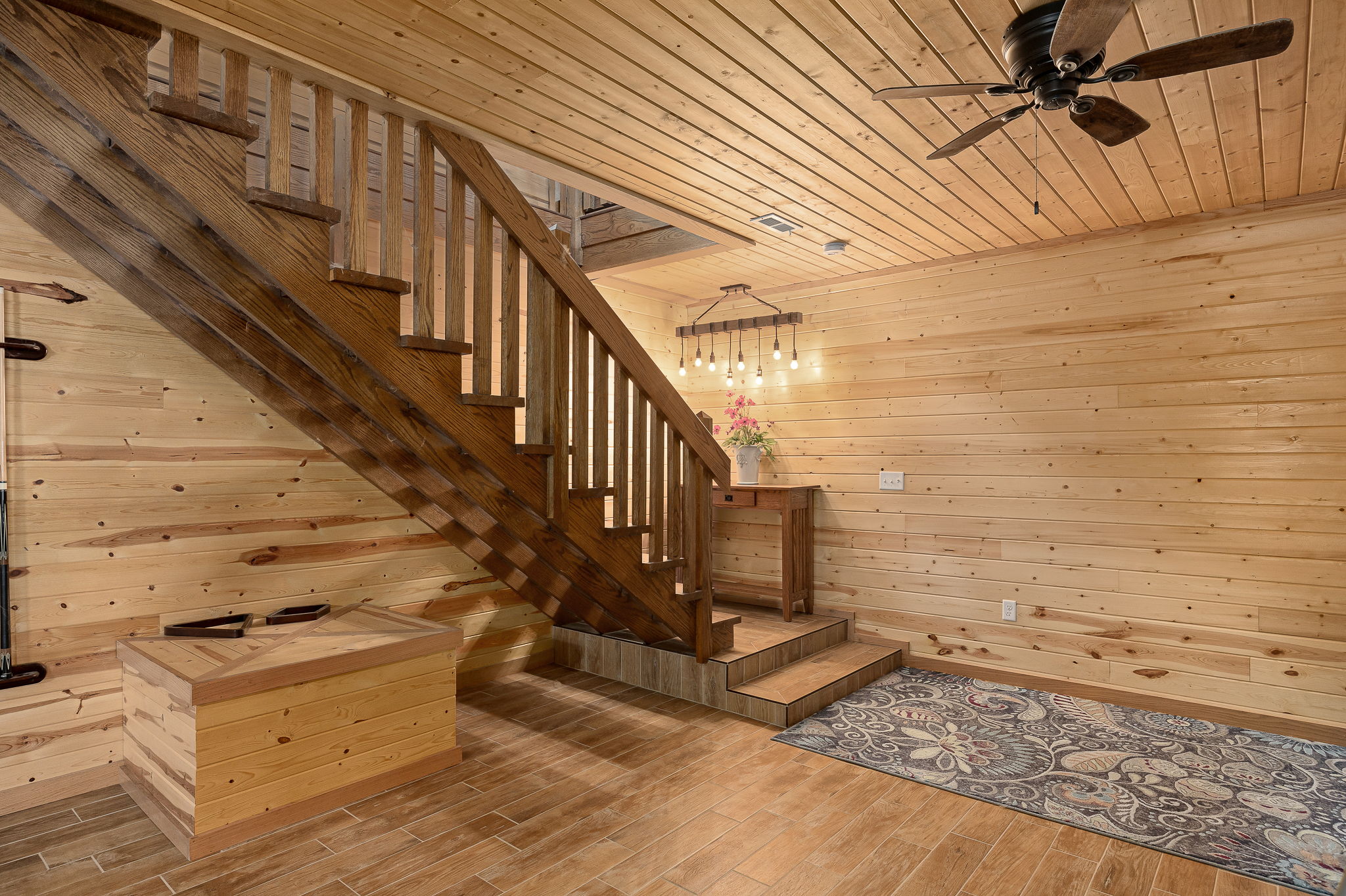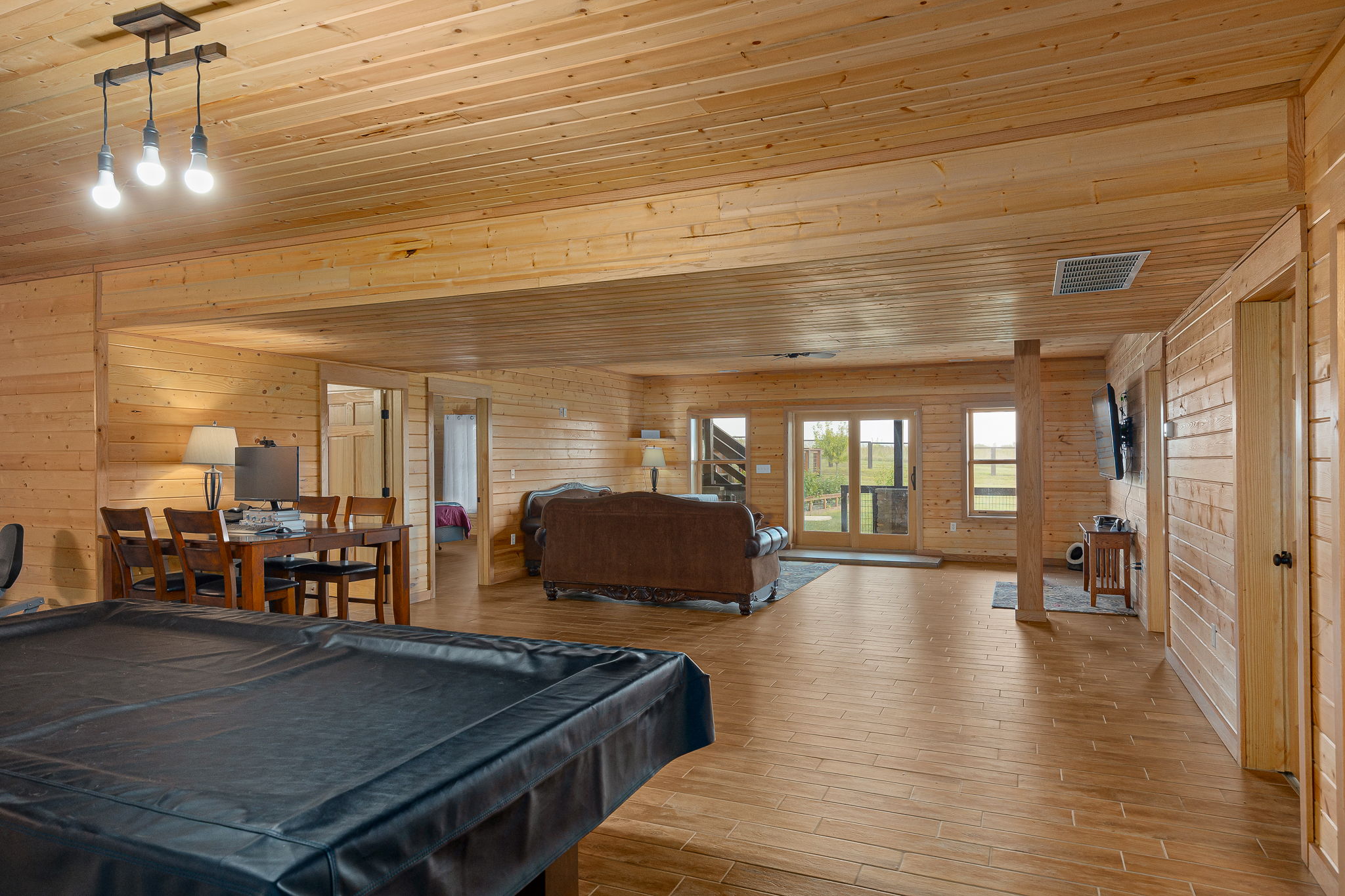 I envisioned leading people downstairs, where they would explore the finished walk-out basement. The pool table, which stays with the property, sits in the center of the living room. The basement also includes 2 more bedrooms, a full bathroom, a safe room, bonus room, and a utility room. I need to remember to point out the dual zone HVAC system ensuring everyone is comfortable, upstairs or downstairs.