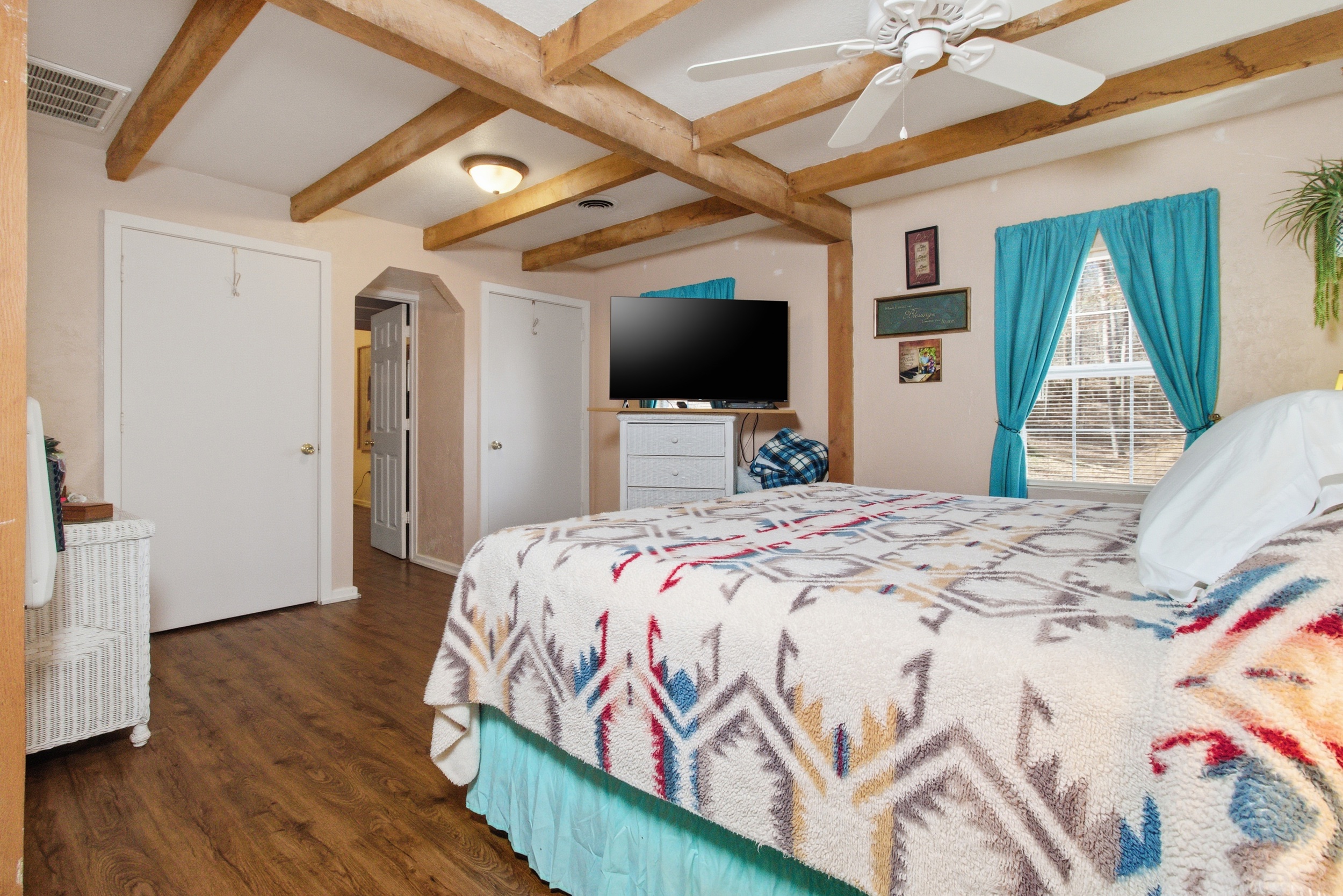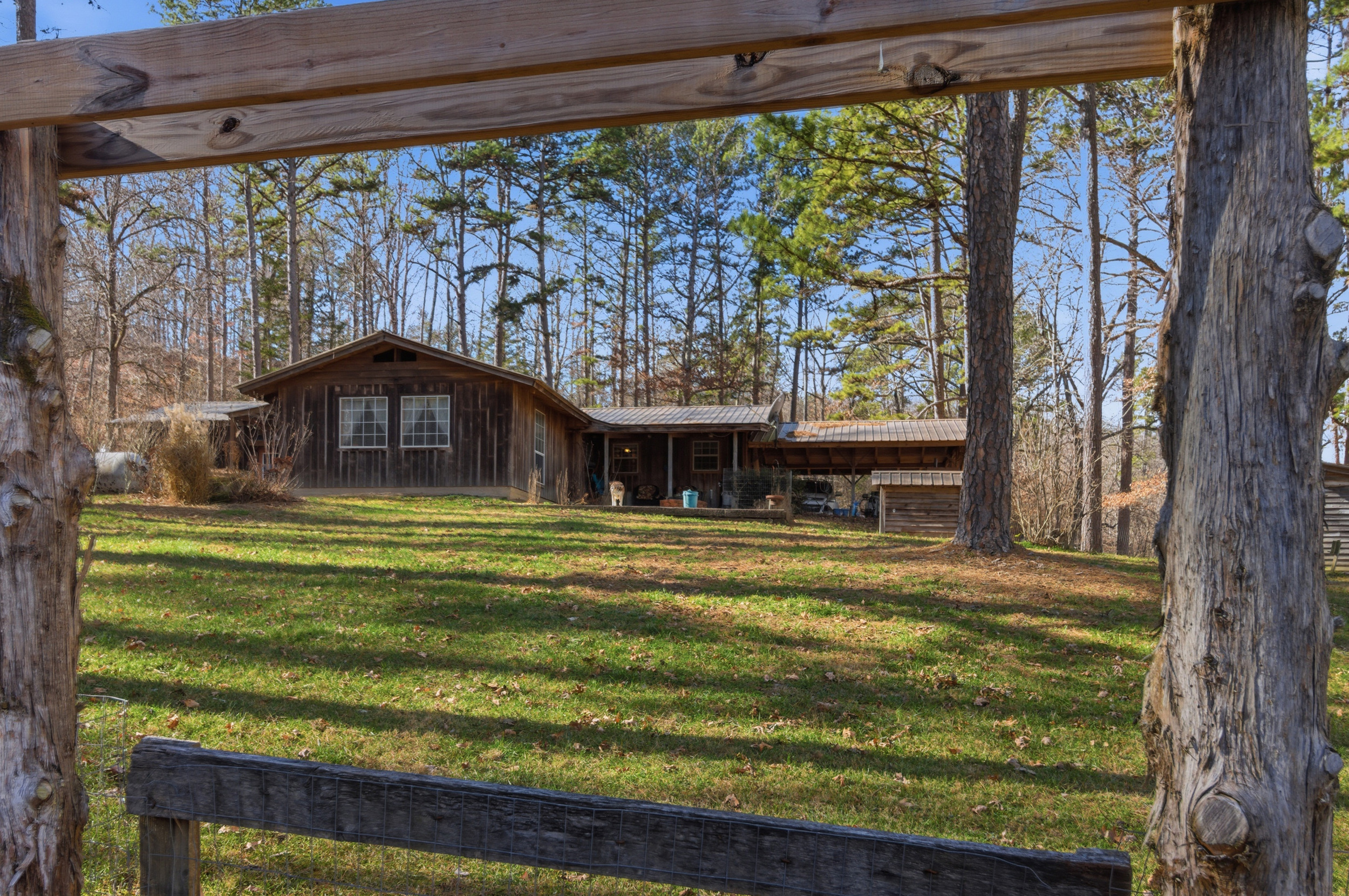 At the heart of the property sits a rustic ranch-style home that blends warmth, character, and functionality. Inside, you’ll find 4 bedrooms and 2 bathrooms, an inviting open hearth room, and two custom native stone fireplaces that anchor the home with true Ozark charm. Exposed oak beams run throughout, adding richness and timeless character.