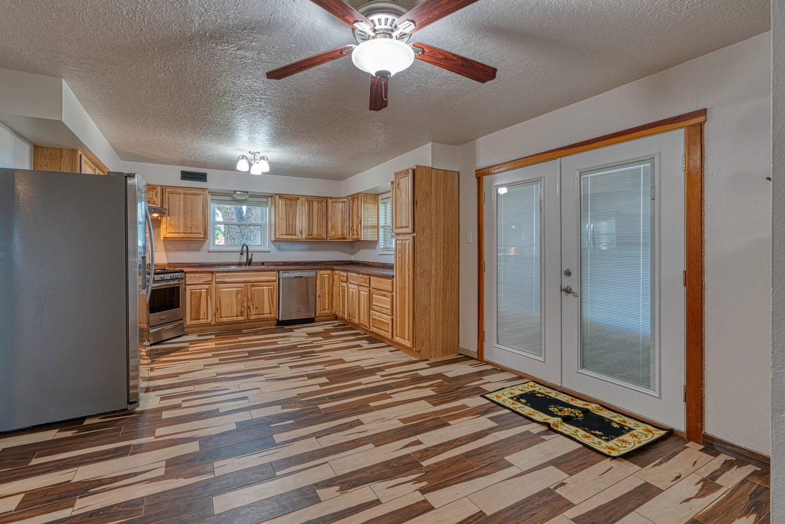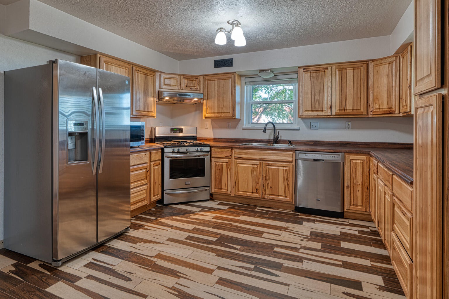 The ranch style home sits at the heart of the property. Originally constructed with solid materials, it underwent a complete remodel in 2016, blending traditional charm with modern updates. The home offers 1,970 square feet with four bedrooms and two baths. Inside, you will find an updated kitchen designed for both functionality and comfort, spacious gathering areas, and plenty of natural light. Outdoors, the courtyard and covered patio create a private retreat for family time, barbecues, or quiet evenings under New Mexico skies.
