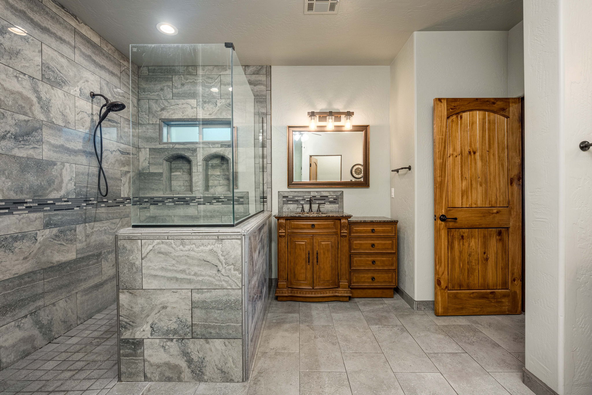 The thoughtfully designed open floor plan showcases a tongue-and-groove foyer, custom architectural arches, a kiva-style fireplace, and solid wood doors throughout. The gourmet kitchen is the heart of the home, featuring an oversized granite island, wine refrigerator, custom skylight, and high-end finishes ideal for both everyday living and entertaining.