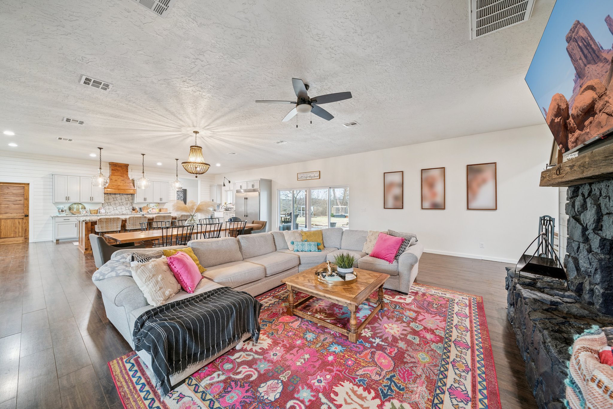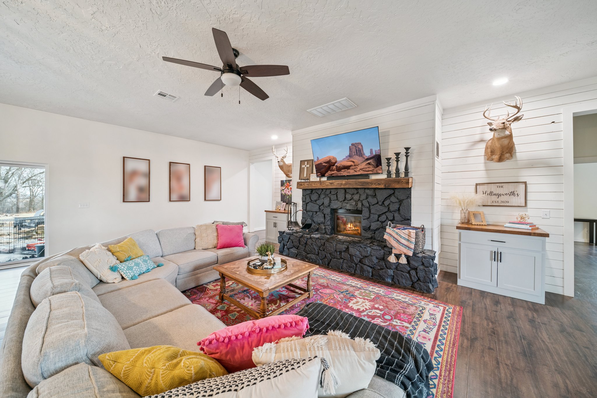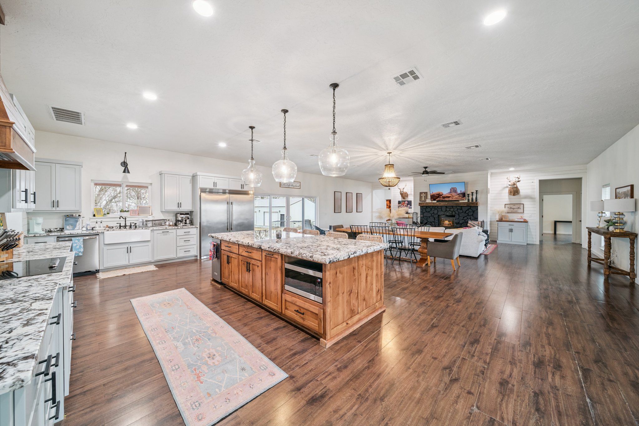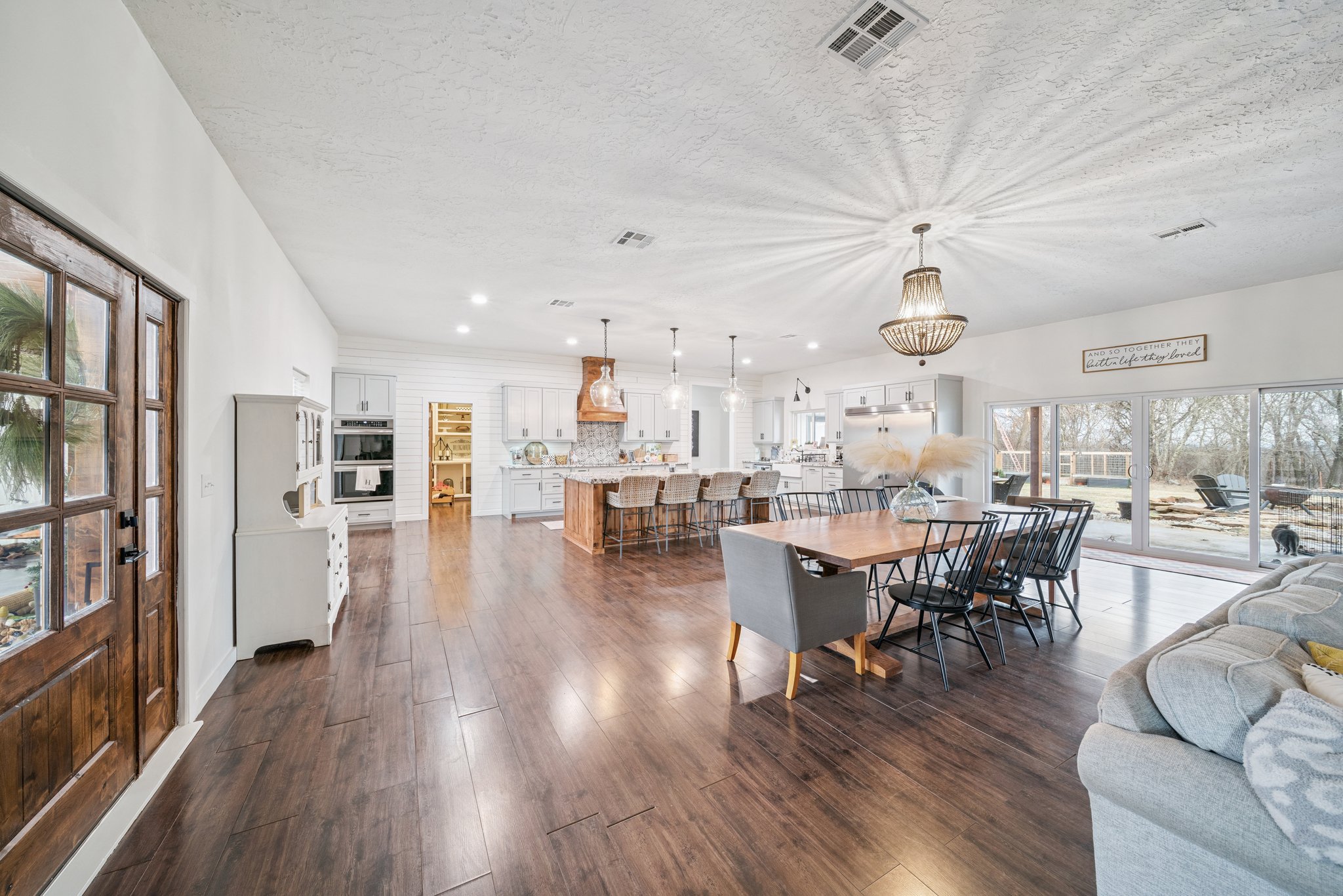 Welcome to this beautiful 3-bedroom, 2.5-bath modern farmhouse offering 3,850 sq ft of thoughtfully designed living space on 6.5 scenic acres in Pryor, Oklahoma. This open-concept home features a spacious living area with a cozy fireplace and a large entertainer’s island, perfect for gatherings and everyday living. The kitchen is a dream with a custom pantry and ample counter space, ideal for hosting and family meals. The primary suite is truly impressive, boasting a large bedroom, luxury bathroom, and an oversized high-end walk-in closet designed for comfort and style. The two guest bedrooms are connected by a Jack-and-Jill bathroom, providing convenient and functional layout. The home includes a safe room in garage and a versatile flex room suitable for a home office, gym, playroom, or additional living space. Enjoy energy efficiency with solar panels to help lower utility bills. Outside, the property shines with a 30x45 shop, chicken coop, garden area, and a custom rock firepit—perfect for relaxing evenings under the stars. A fenced area for animals adds functionality, while the beautiful panoramic views provide a peaceful country setting. This property offers the perfect blend of modern comfort and rural charm — space to live, entertain, and enjoy the outdoors. Call today and let's go take a look.