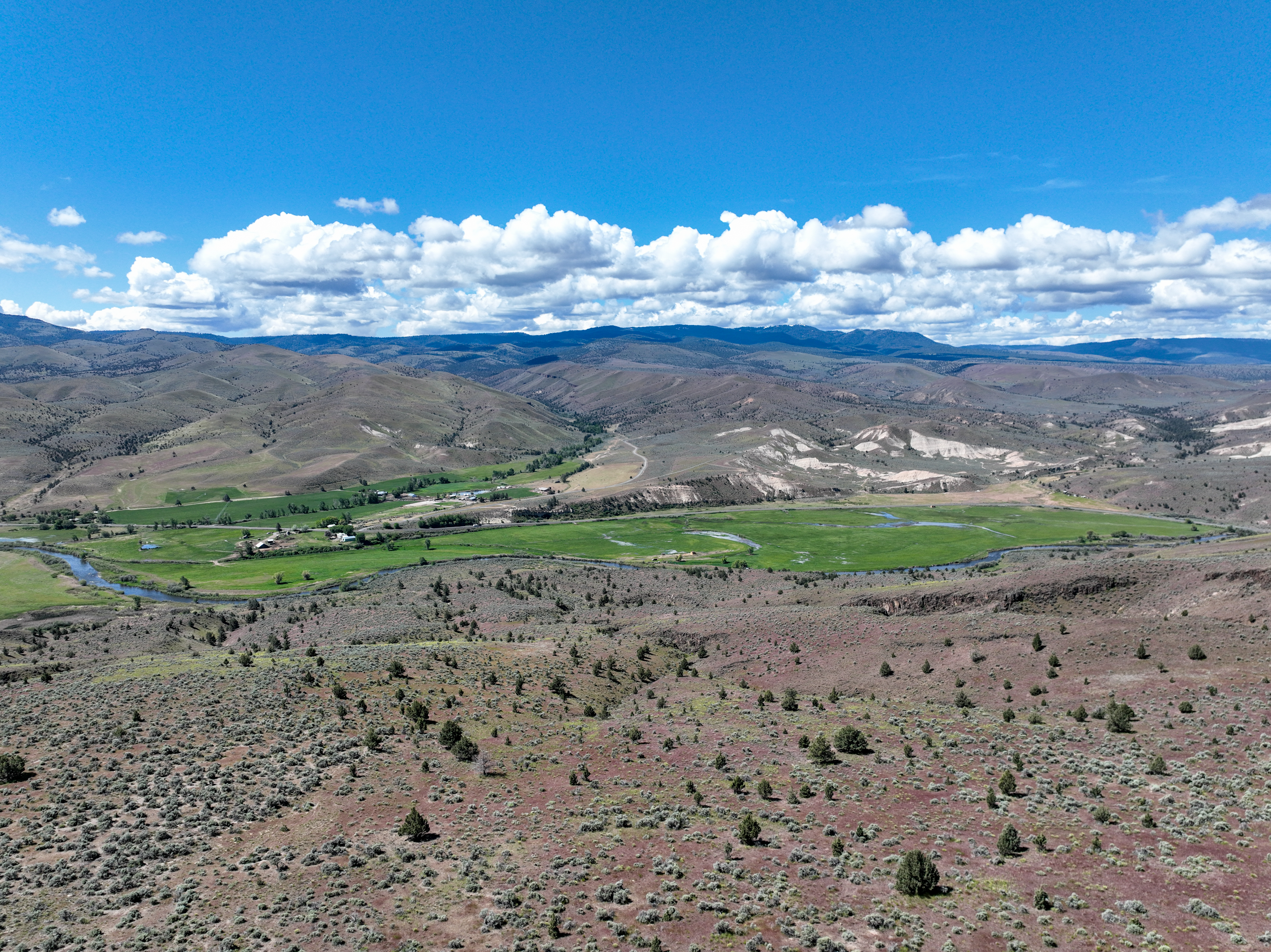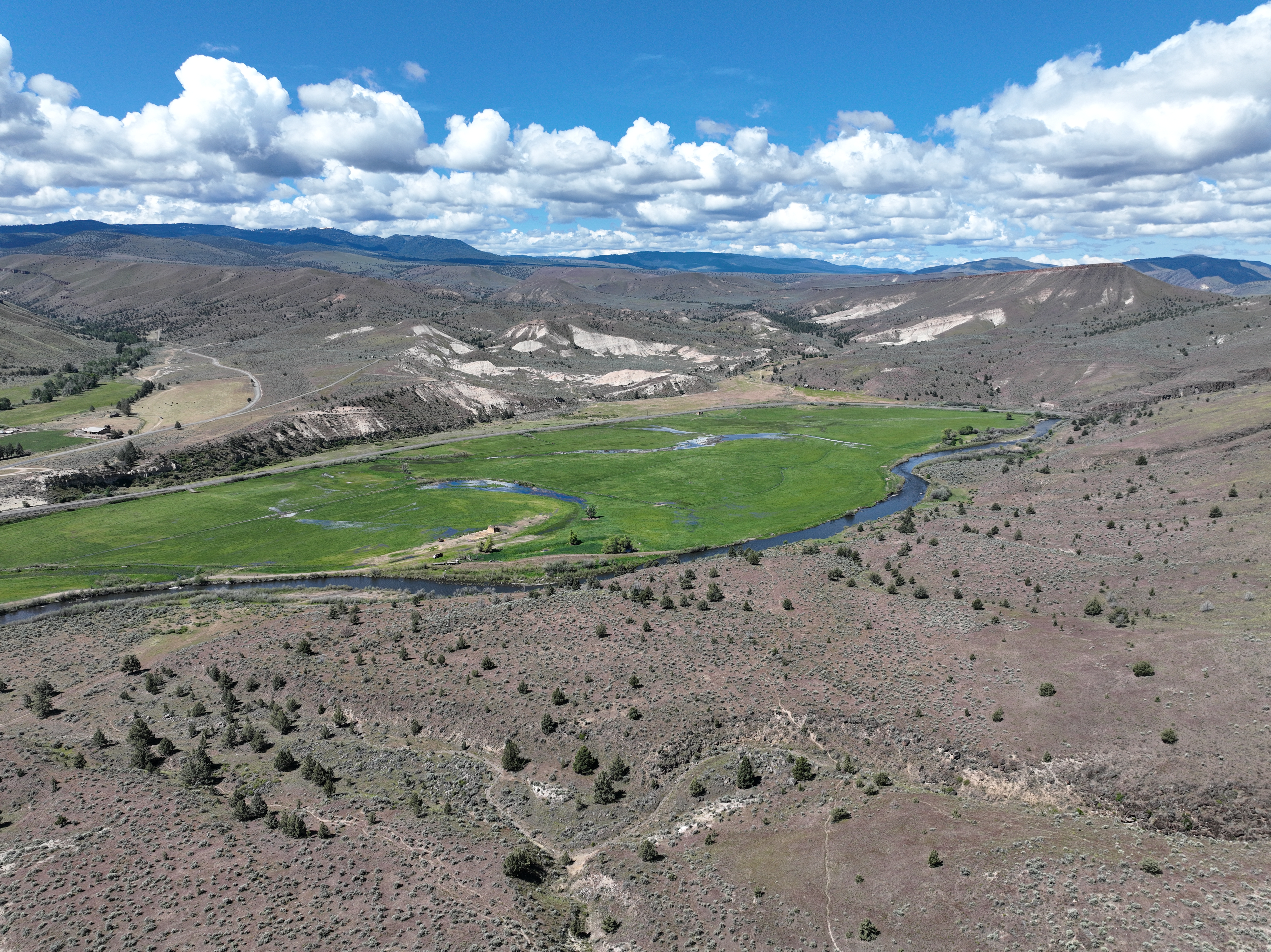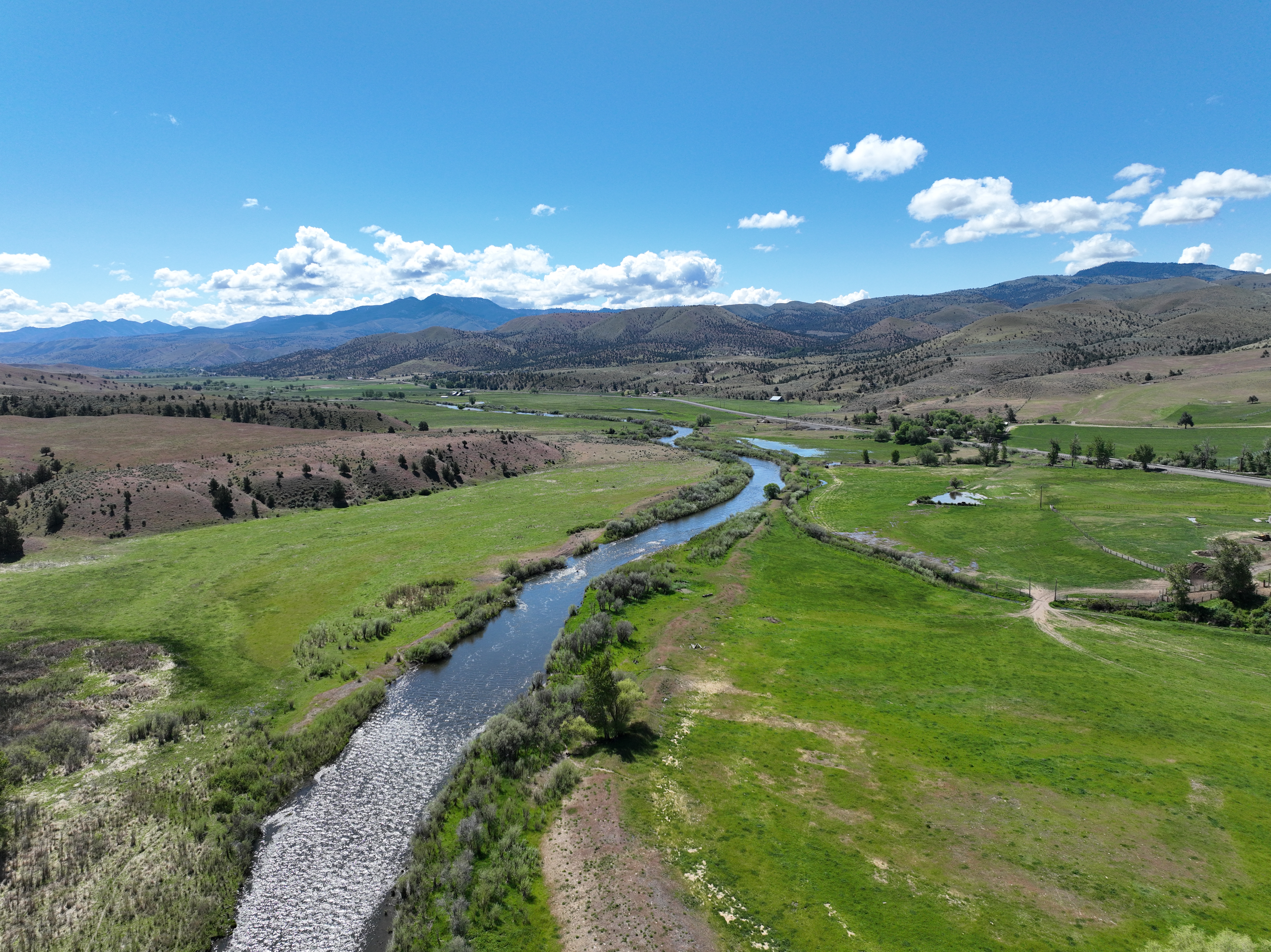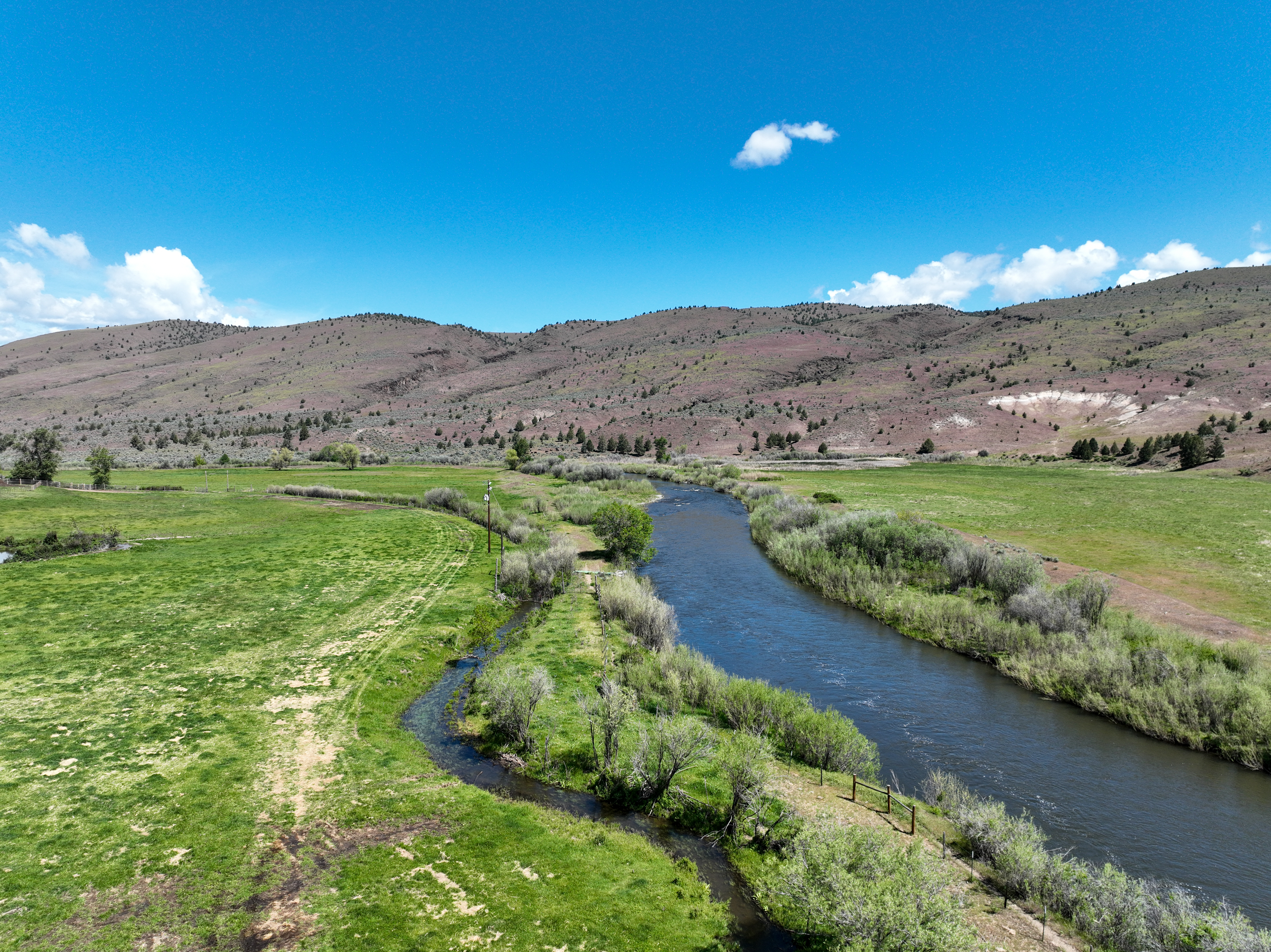 The ranch features an impressive variety of terrain, with dramatic elevation changes ranging from 2,240 to 4,680 feet. Water is found throughout portions of the ranch, with natural springs and creeks weaving through the land before feeding into the John Day River, which flows for approximately 1.75 miles across the property. Notable water sources include Day Creek, Little Rattlesnake Creek, and Rattlesnake Creek, which serve as primary tributaries. Irrigation is sourced from both the John Day River and Cottonwood Creek, supporting approximately 260.8 acres of water rights.