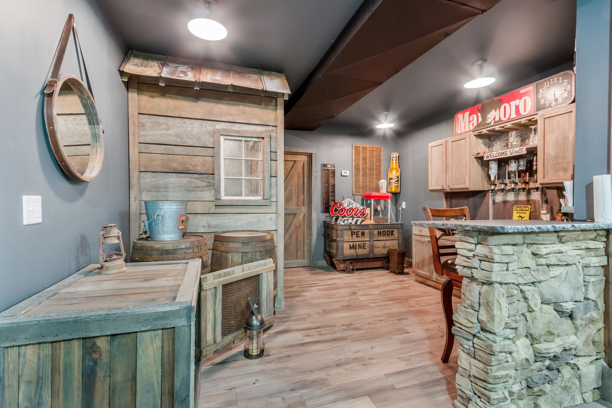 The lower level offers a custom home theater, ideal for movie nights or gatherings. Step outside to your own private oasis featuring an 18’ x 36’ saltwater pool surrounded by peaceful scenery. A steel barndominium of nearly 1,100 sq. ft. adds exceptional versatility, including living quarters, three horse stalls and a tack room—perfect for equestrian use, hobbies, or extra storage which is climate controlled. This unique property combines comfort, function, and privacy, offering an unparalleled lifestyle in a truly special setting.