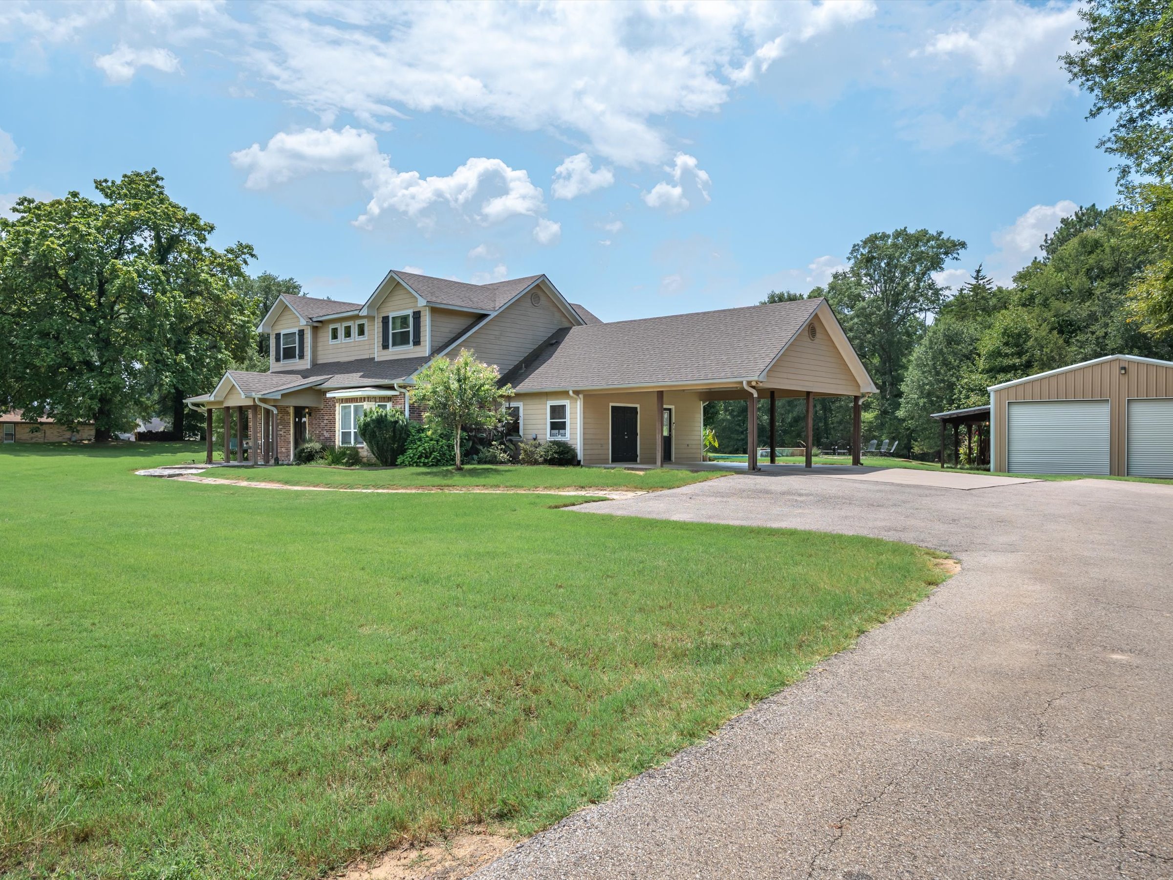 Just 2 miles from Winnsboro in Wood County, this stunning 4-BR-3.5BA home offers the perfect combination of comfort, convenience, & country living. Situated on 5.52 acres of rolling pasture & woods with a stocked pond, the property provides both open space & privacy. The two-story home welcomes you with an expansive den featuring a vaulted ceiling & a WBFP, seamlessly connected to the dining area & gourmet kitchen. The kitchen is designed for both functionality & entertaining, complete with granite countertops, an island, eating bar, gas cooktop, double ovens, serving area, pantry, & generous counter space. The primary suite is located downstairs, highlighted by wood floors & a trey ceiling. The en suite bath includes granite vanities with double sinks, a walk-in shower, jetted tub, & spacious walk-in closet with built-in dressers & shelving. Additional first floor amenities include a home office, large utility room with folding counter & cabinetry & a versatile mudroom/bonus space conveniently located at the carport entry. Upstairs, you’ll find 3 bedrooms. One has a private bath, while the other two share a Jack-and-Jill style bathroom. Outdoor living is a true highlight of this property. A covered 11x21 back patio overlooks the in-ground pool with hot tub spillover. Adjacent to the pool is a fully outfitted outdoor kitchen incorporated into the side of the 30x50 insulated shop complete with a large serving bar & a half bath. The shop features an overhead door for vehicle or equipment storage, & a 10x50 covered lean-to extends from the north side for additional shelter & utility. With an agricultural tax exemption in place, this property offers all the enjoyment of country life with the convenience of being just minutes from town - without city taxes. ::: Substantial painting allowance with acceptable offer. :::