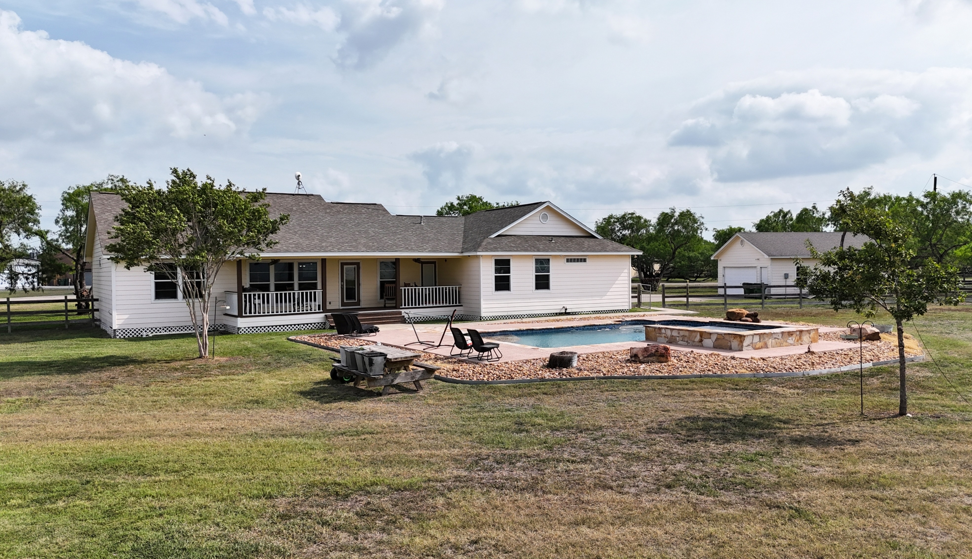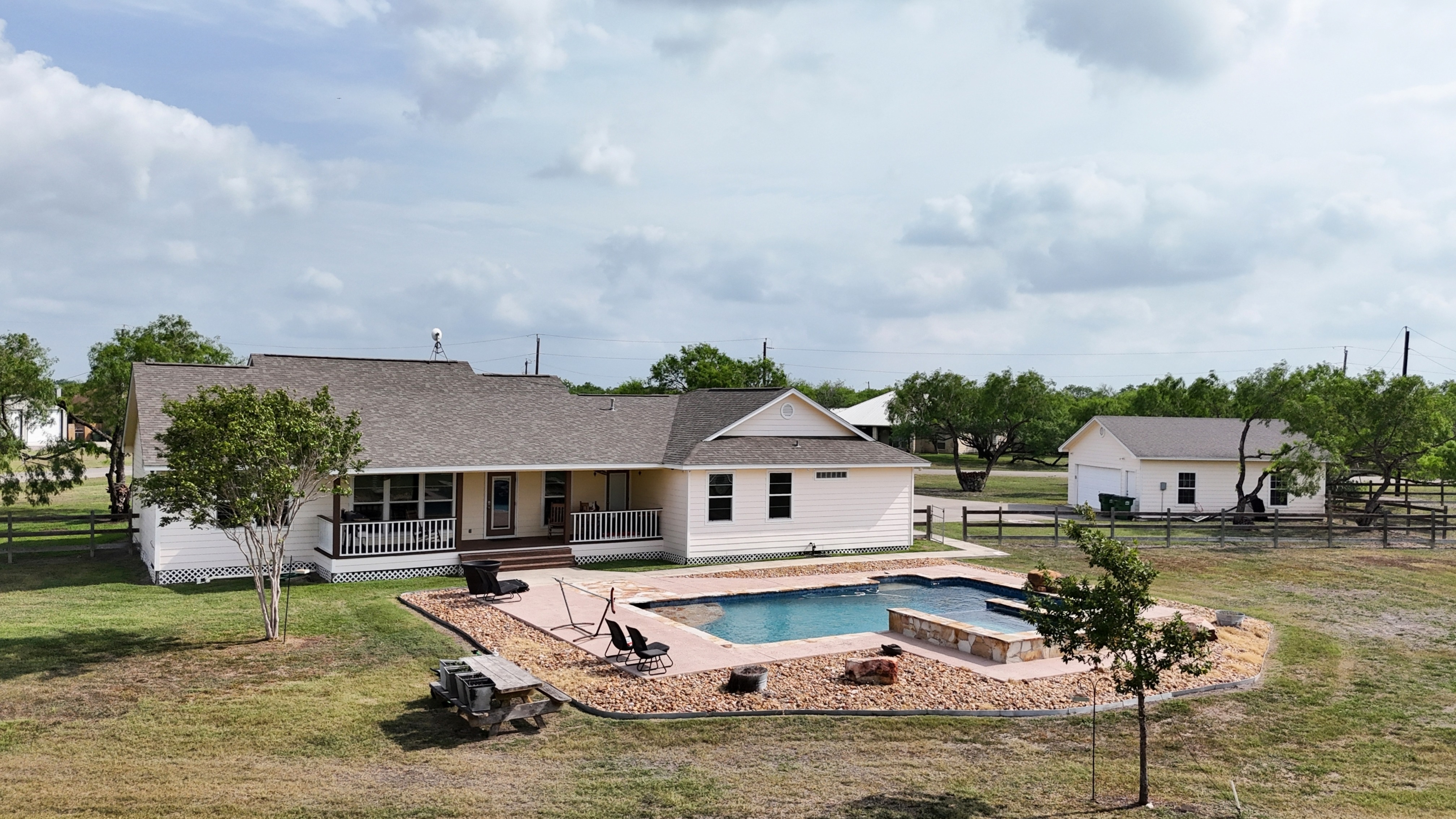 Nestled in the desirable New Westlake Subdivision, this beautiful 4-bedroom home offers the perfect blend of country living with easy access to town - just 12 miles from Calallen and 7 miles from Orange Grove. Enjoy peaceful mornings and stunning sunsets in the evening from your covered front and back porches. Step inside to a spacious, open-concept living and dining area with soaring vaulted ceilings - ideal for gatherings and entertaining. The oversized fourth bedroom offers versatility as a media room, game room, or home office. Step outside to your private oasis featuring an 18x30 saltwater pool, a 40x40 workshop, a chicken coop, a dog run, and a 20x40 covered area perfect for livestock or 4H/FFA projects. Major updates include NEW AC system installed March 2024 and NEW ROOF installed January 2025. This property has it all! Call your favorite realtor and schedule your private showing now!