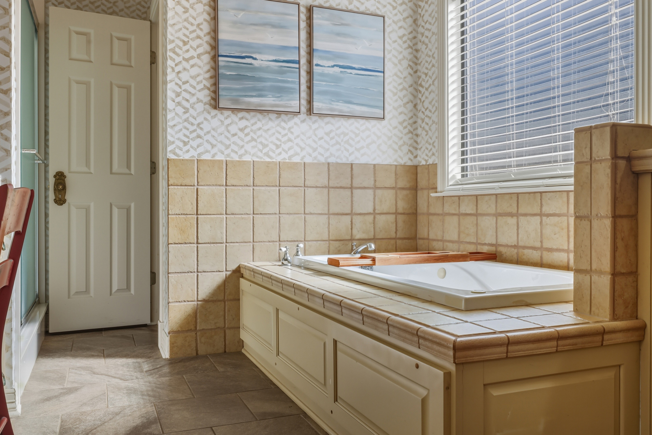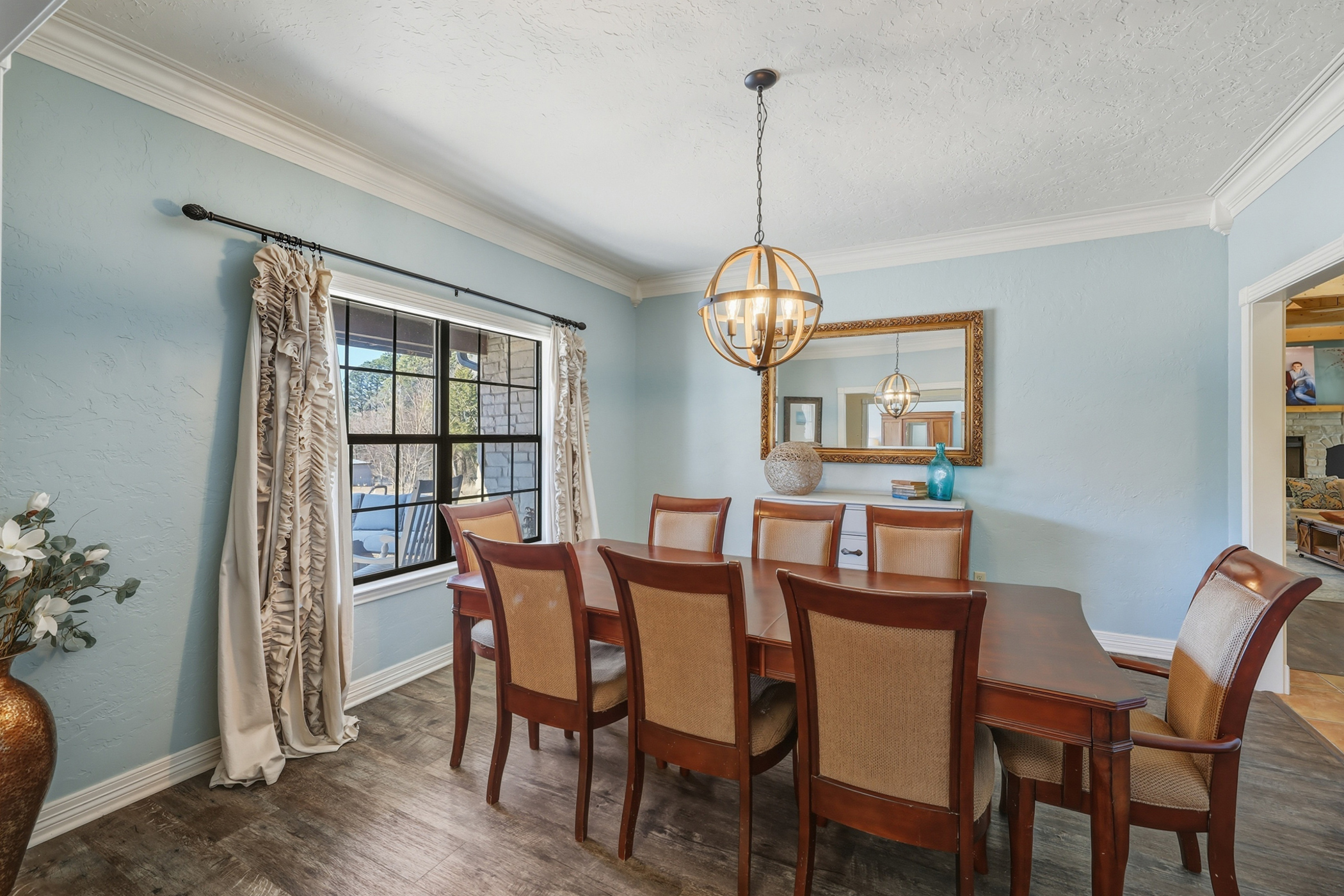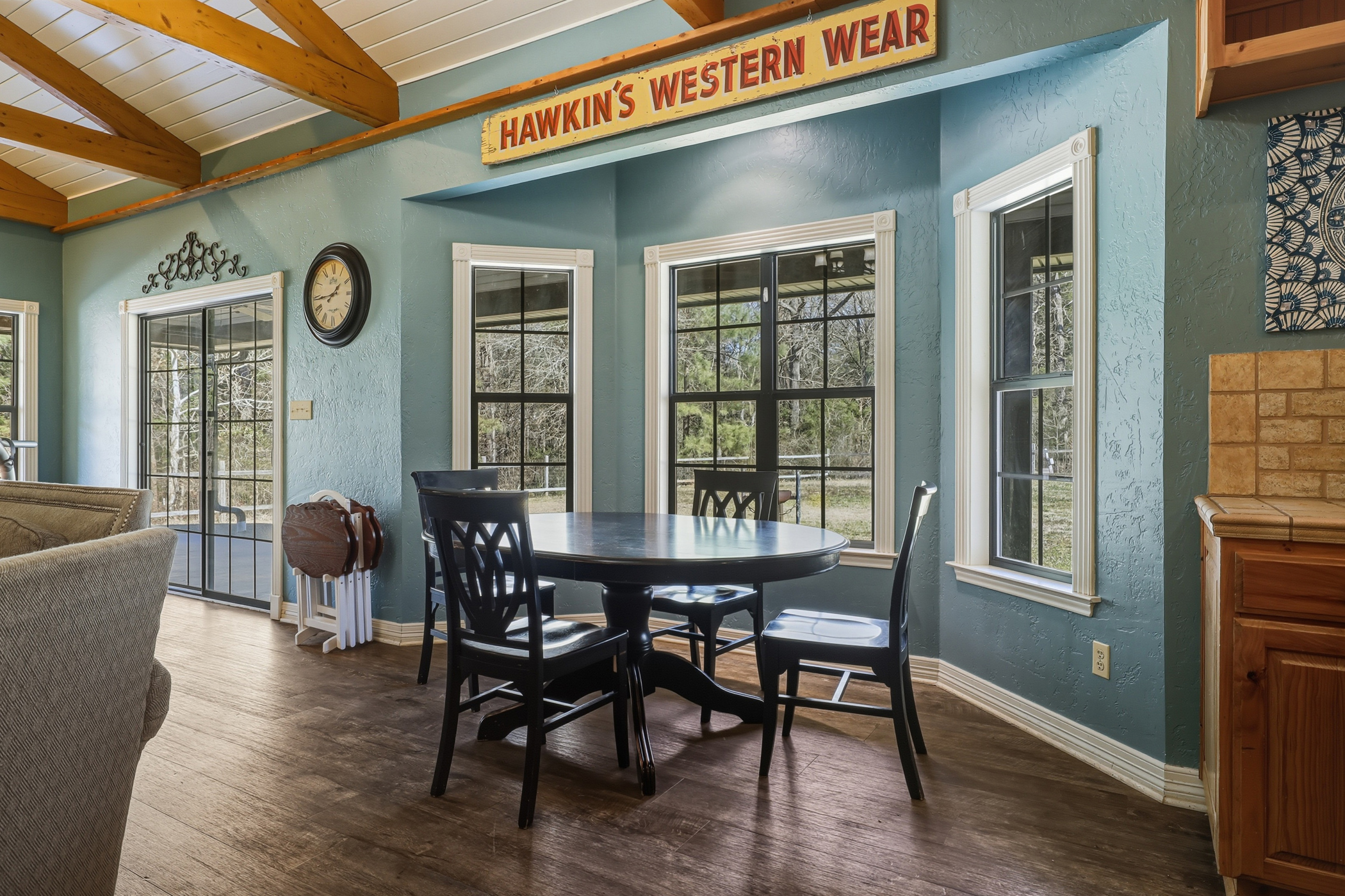 the home to a wide entry with a formal dining room on one side, perfect for holiday gatherings and family celebrations. The adjacent room offers flexibility as a formal living room, home office, music room, or private library. The heart of the home is the expansive vaulted living room with exposed beams, seamlessly flowing into the breakfast nook and into a large, well-appointed kitchen. Designed for both everyday living and entertaining, the kitchen boasts a gas burner cooktop, double ovens, oversized