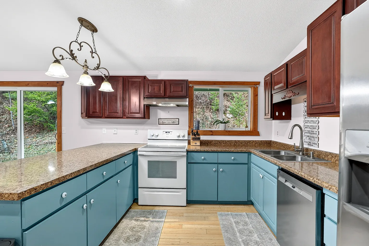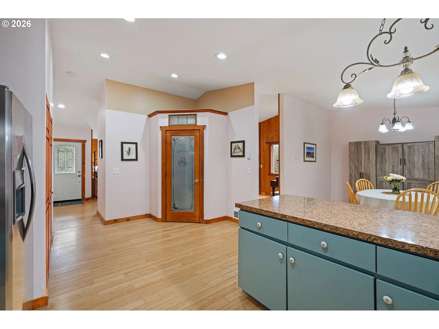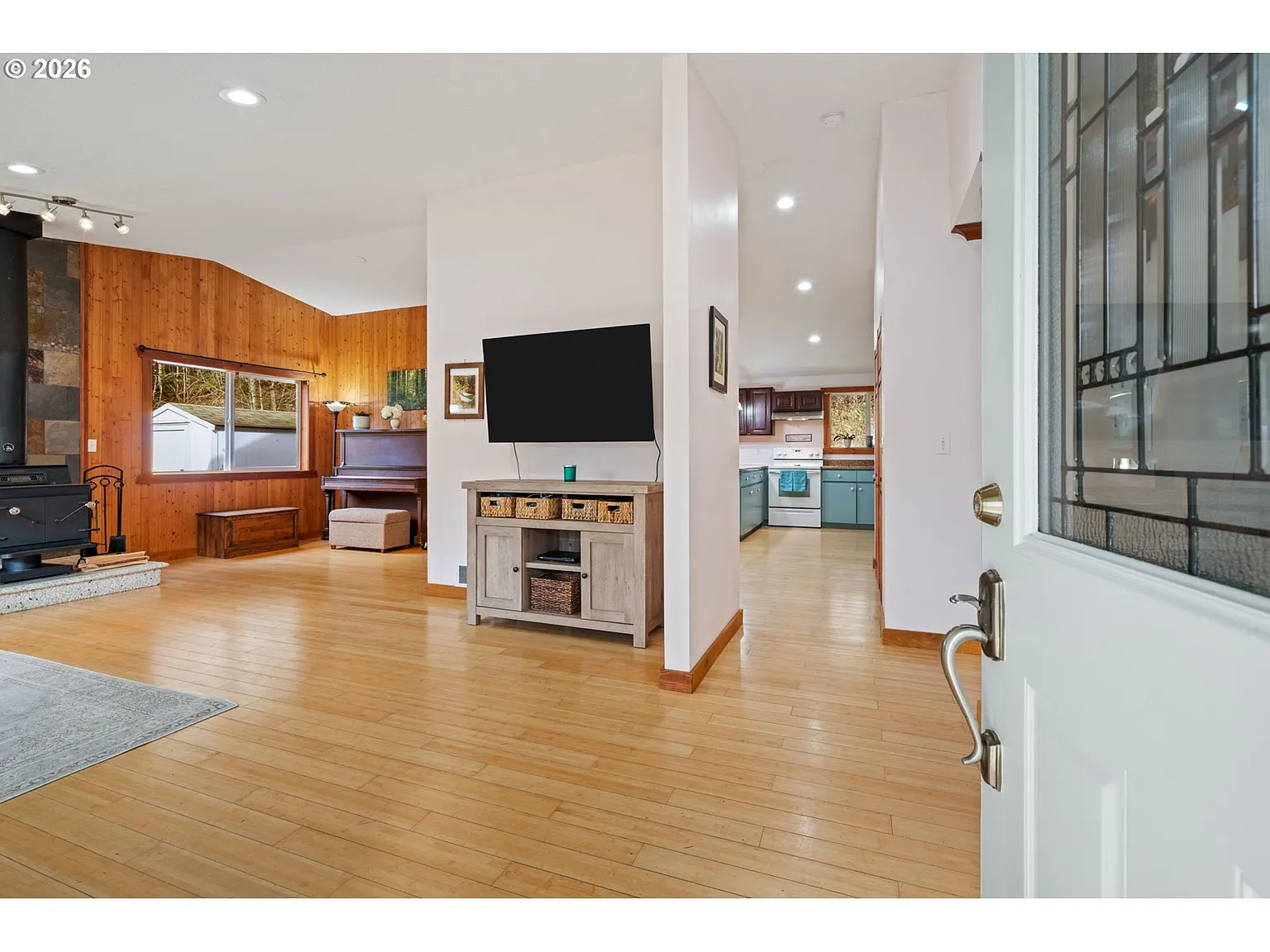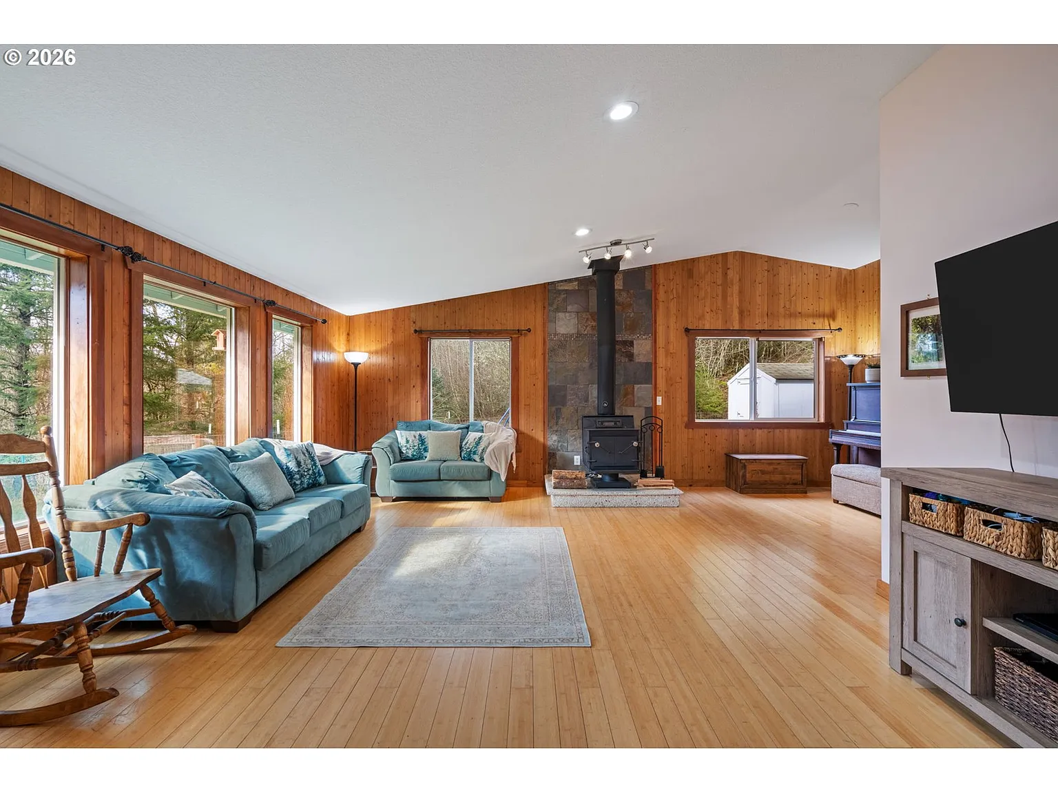Inside the home, the vaulted living room features warm woodwork, a striking stone accent, bamboo and laminate flooring, and large windows that bring in abundant natural light while framing the surrounding forest views. The spacious kitchen with pantry flows into a formal dining area, creating a comfortable layout for everyday living and entertaining.