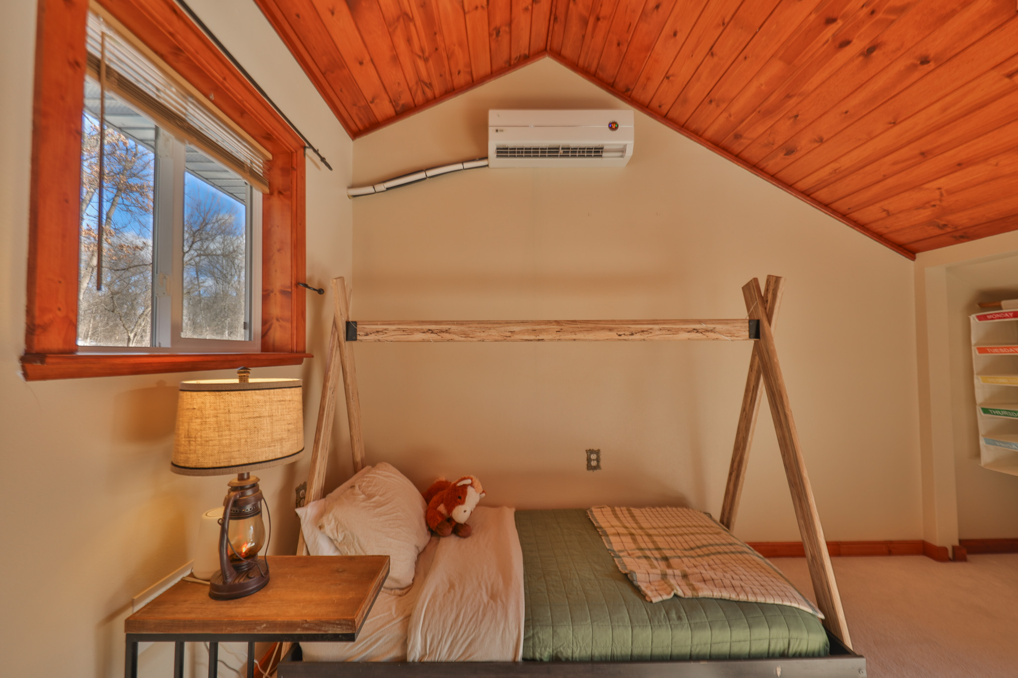 Upstairs, the main floor opens into a generous kitchen with island seating, flowing effortlessly into a bright dining room surrounded by oversized picture windows. Natural light pours in from every direction. A spacious bathroom with dual sinks sits just off the living area, while the primary bedroom suite features its own full bath. The upper level includes a secondary bedroom currently used as a dual children’s retreat — cozy, practical, and full of character.