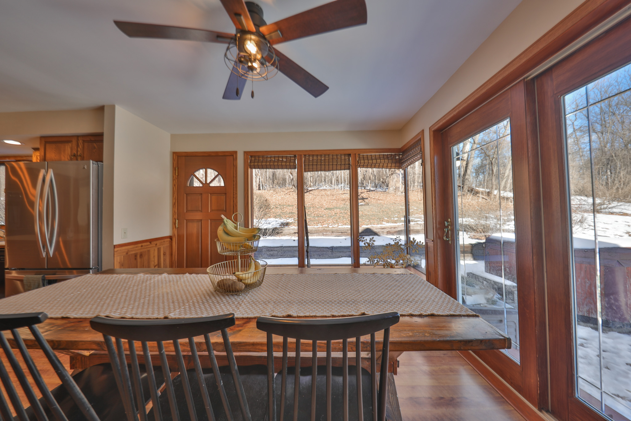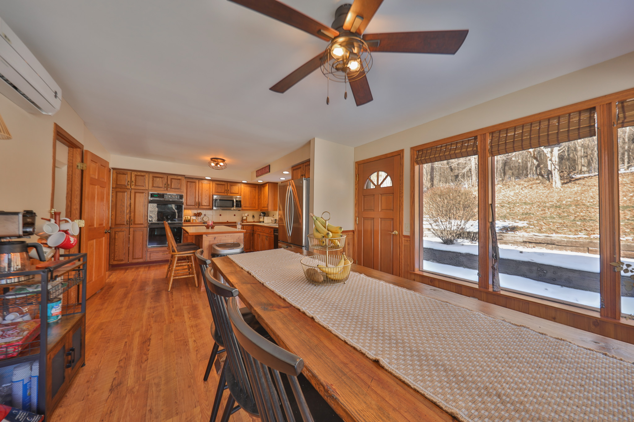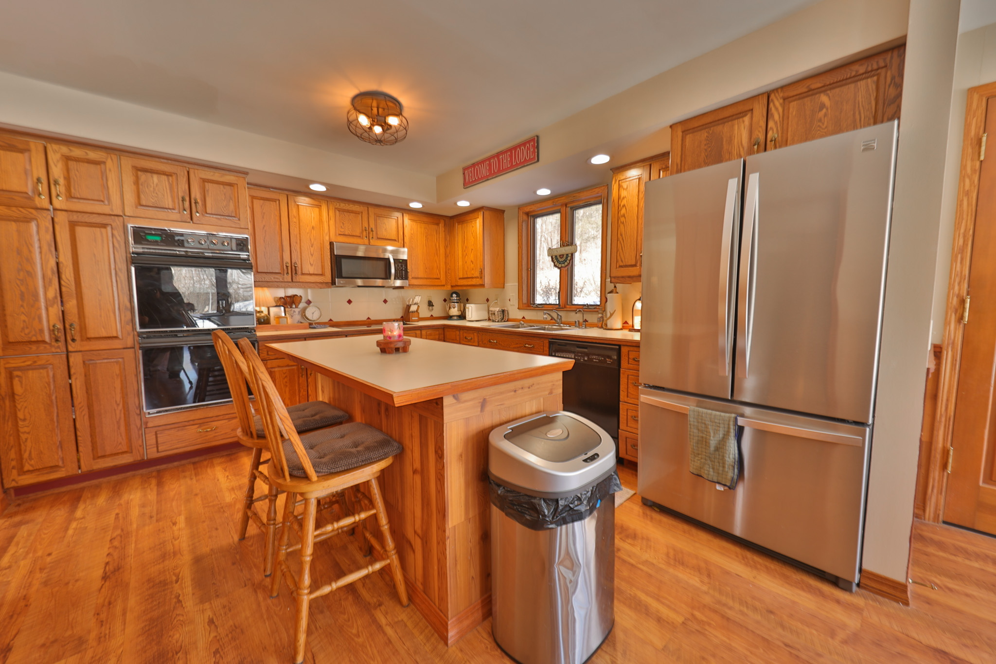 Accessed from the deck, the West wing showcases warm woodwork and vaulted ceilings that create an inviting lodge-like atmosphere. A comfortable living room with abundant windows anchors the main floor, accompanied by a half bath and bright eat-in kitchen.